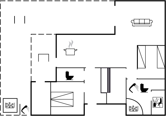 Es gibt ein schönes Badezimmer mit neuem Whirlpool und Sauna sowie eine gepflegte Gäste-Toilette. Das Haus verfügt über drei Schlafzimmer, bei denen besonderer Wert auf hochwertige Matratzen gelegt wurde. Zwei Zimmer sind mit Doppelbetten ausgestattet und ein Zimmer mit einem Etagenbett. Außerdem gibt es eine Schlafempore mit zwei guten Einzelbetten. Die Betten auf dem offenen Obergeschoss haben normale Bettgröße, sind jedoch am besten für Kinder oder Erwachsene ohne Gehprobleme geeignet.