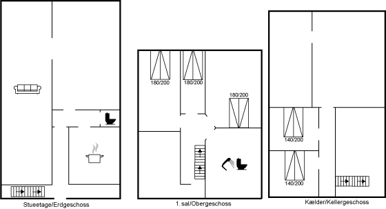 Die Schlafplätze der Hauses verteilen sich auf zwei Zimmer mit je einem Schlafplatz im Kellergeschoss und drei Zimmer mit je zwei Schlafplätzen im Obergeschoss.