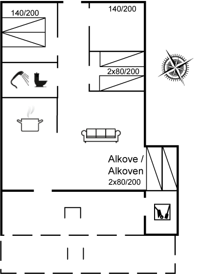 Bitte beachtet, dass sich zwei der Schlafplätze des Ferienhauses in dem Alkoven im Wohnküchenbereich befinden.
