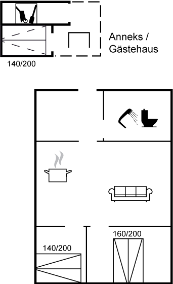 Im Anbau gibt es ein Schlafsofa, das leicht zu einem Doppelbett umfunktioniert werden kann, inklusive einer Toppermatratze.