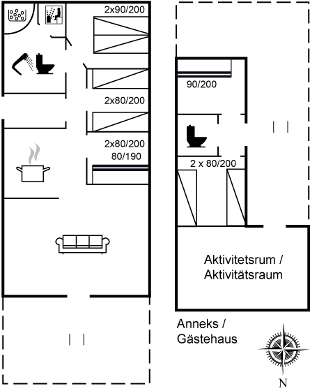 Dieses schöne Sommerhaus liegt auf einem großen eingezäunten Grundstück, auf dem Erwachsene, Kinder und der Vierbeiner viele schöne Stunden im Freien verbringen können. Sollten Sie Schwierigkeiten haben die Kinder zum Essen oder Abends ins Haus zu rufen, liegt es wahrscheinlich am großen und schönen Spielhaus, das sowohl beheizt ist als auch Licht installiert hat. Darüber hinaus gibt es ein großes Gästehaus mit 4 Schlafplätzen (auf 2 Schlafzimmer verteilt), 1 Gästetoilette sowie einen großen Aktivitätsraum mit verschiedenen Spielmöglichkeiten - und Trainingsgeräten.