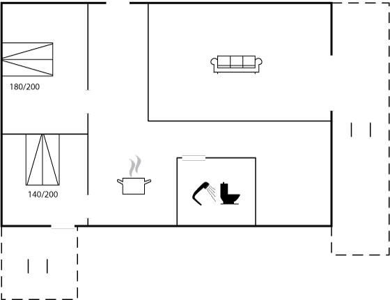 Vom Küchenbereich und den Schlafzimmern führt eine weitere kleine Treppe in einen stilvollen Wohnraum mit Essbereich, TV-Ecke und direktem Zugang zur Terrasse. Das Haus verfügt zudem über zwei offene Obergeschosse: eines beim Wohnraum und eines mit besonders guter Deckenhöhe und bequemer Treppe. Insgesamt stehen euch zwei Schlafzimmer und zwei offene Obergeschosse zur Verfügung – jeweils mit zwei Schlafplätzen, wobei eines der Obergeschosse mit einem Doppelbett ausgestattet ist. Es gibt also ausreichend Platz für Familie und Gäste.