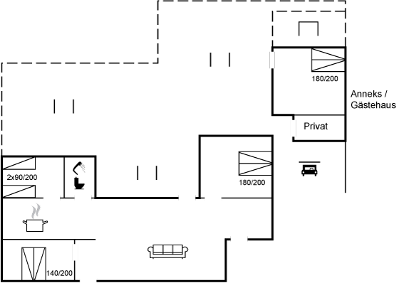 Das Ferienhaus wurde 2024 teilweise renoviert und bietet ein behagliches Wohnzimmer mit großem Essbereich sowie eine gut ausgestattete Küche. Innen findest du drei Schlafzimmer, zwei davon mit Doppelbett und eines mit Etagenbett. Das dazugehörige große Gästehaus verfügt ebenfalls über ein Doppelbett und sorgt so für zusätzliche Flexibilität bei der Übernachtung.