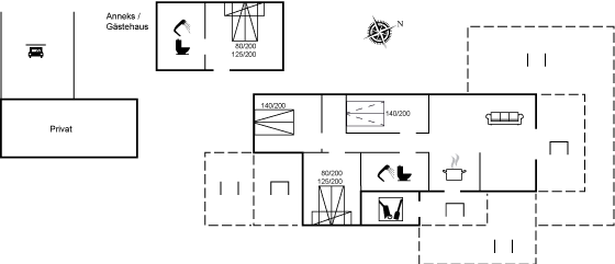 Bitte beachtet, dass drei der Schlafplätze im Gästehaus liegen, wo ein Etagenbett mit einem Doppelbett unten und einem Einzelbett oben steht. Hier gibt es auch ein separates Badezimmer.