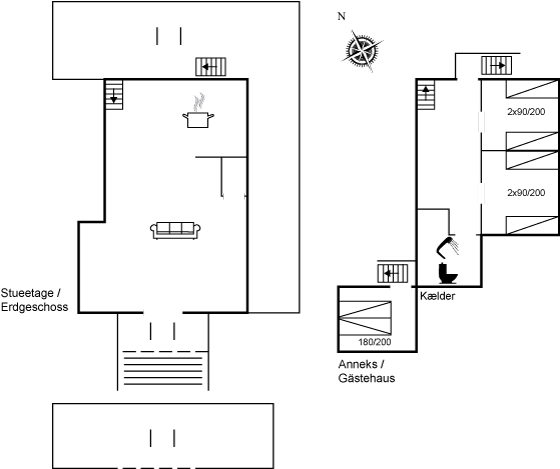 Die Schlafzimmer und das Badezimmer des Hauses befinden sich im Kellergeschoss, das von außen zugänglich ist. Außerdem gibt es in der Ecke vom Wohnzimmer eine Bodenluke, von hier führt eine Treppe in das Kellegeschoss. Diese Treppe ist jedoch nicht für gehbehinderte Personen geeignet und bietet nur wenig Platz.