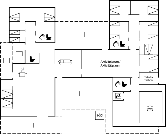 Im Zentrum des Hauses befindet sich der Treffpunkt mit einem großen Aktivitätsraum mit Tischtennis, Tischfußball, Billard, Poolbillard, Airhockey, Fernseher und PlayStation 5.