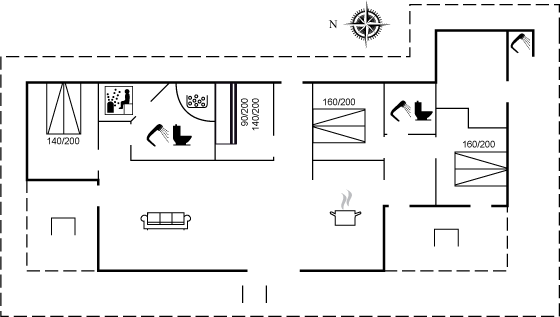 Es gibt vier Schlafzimmer, von denen zwei mit Doppelbetten ausgestattet sind. Ein Schlafzimmer hat ein Etagenbett mit insgesamt drei Schlafplätzen, und im nach Norden ausgerichteten Zimmer mit vollem Meerblick, das auch als gemütlicher Bereich im Wohnzimmer dient, gibt es ein Schlafsofa für zwei Personen. Es gibt zwei Badezimmer mit Fußbodenheizung, im größeren davon zusätzlich Spa, Sauna und eine kombinierte Waschmaschine/Trockner.