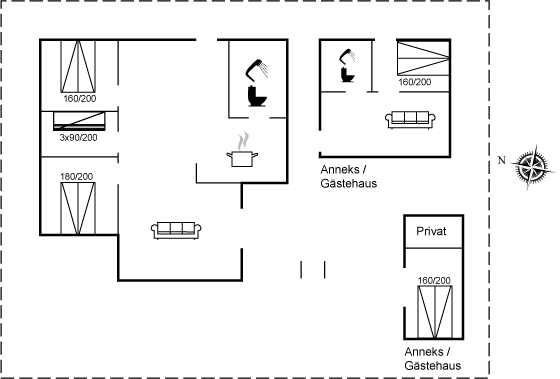 Im Haupthaus gibt es drei Schlafzimmer: Zwei davon mit Doppelbetten und eines mit einem Etagenbett mit insgesamt drei Schlafplätzen (unten befindet sich ein ausziehbares Bett). Badezimmer mit Duschnische und Fußbodenheizung.
