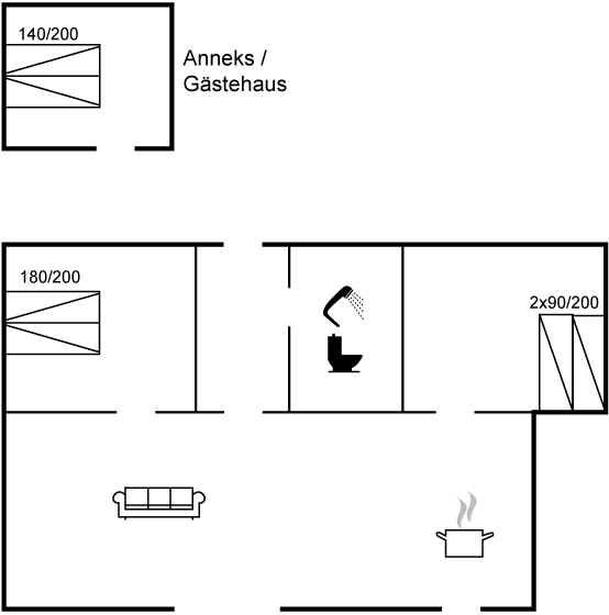 Badezimmer mit Duschnische, Fußbodenheizung sowie Waschmaschine und Wäschetrockner. Im praktischen Eingangsbereich gibt es Fußbodenheizung. Das Haus verfügt über 2 gute Schlafzimmer; 1 mit Doppelbett und 1 mit 3 Einzelbetten. Außerdem gibt es ein schönes Gästehaus, ebenfalls 2015 erbaut, mit Doppelbett. Das Haus wird mit einer energieeffizienten Luft-Luft-Wärmepumpe beheizt. Es steht ein Carport zur Verfügung.
