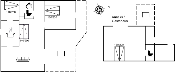 Im Haus gibt es zwei Schlafzimmer mit jeweils zwei Schlafplätzen in Doppelbetten. Im großen Schlafzimmer ist das Bett mit elektrischer Verstellung ausgestattet. Im Wohnzimmer befindet sich eine Schlafcouch mit zwei weiteren Schlafplätzen. Im 30 Quadratmeter großen Gästehaus gibt es ebenfalls ein Doppelbett mit zwei Schlafplätzen sowie eine Toilette. Das Haus eignet sich daher hervorragend für zwei Familien. Im Haupthaus befindet sich ein Badezimmer mit Duschnische und Fußbodenheizung. Beheizt wird das Haus mit Elektroheizkörpern und einem Kaminofen. Das Gästehaus verfügt über eine Elektroheizung.
