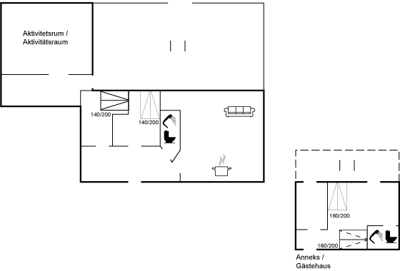 Das Haus hat eine Wohnfläche von 124 m² sowie ein dazugehöriges Gästehaus und einen Aktivitätsraum. Das Sommerhaus ist mit einer schönen Küche in offener Verbindung mit dem Essbereich und dem Wohnzimmer eingerichtet. Von hier hast du direkten Zugang zum Innenhof und zur Sonnenterrasse. Außerdem gibt es einen Eingangsbereich, ein Badezimmer und zwei Schlafzimmer – beide mit Doppelbetten.