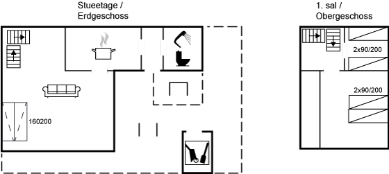 Das Ferienhaus erstreckt sich über zwei Etagen, die Schlafzimmer befinden sich im 1. Stock. Das Wohnzimmer ist hell, schön eingerichtet und funktional gestaltet. Angrenzend an das Wohnzimmer befindet sich die Küche, die praktisch und gut ausgestattet ist mit allem, was man im Urlaub benötigt. Das Badezimmer ist nicht groß, aber modernisiert und ansprechend.