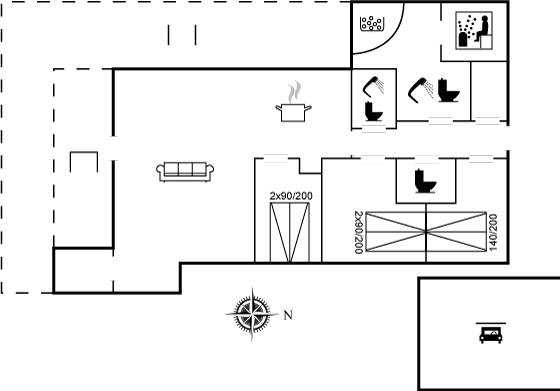 Das Haus ist mit einem großen Wohnzimmer mit offener Küche eingerichtet und bietet direkten Zugang vom Wohnzimmer auf die große Holzterrasse, wo man ungestört die Sonne genießen kann. Die Familie kann sich hier zu einem schnellen Sommermittagessen in der ruhigen Umgebung versammeln. Helle Holzwände und -decken sowie weiß laminiertes Kiefernholzboden verstärken das luftige Raumgefühl. Mit drei Schlafzimmern und zwei Badezimmern, von denen eines mit Whirlpool und Sauna ausgestattet ist, gibt es ausreichend Platz für alle.