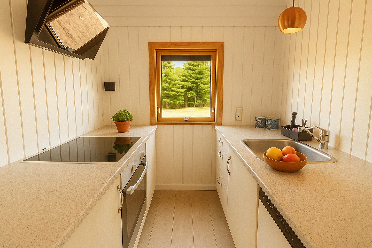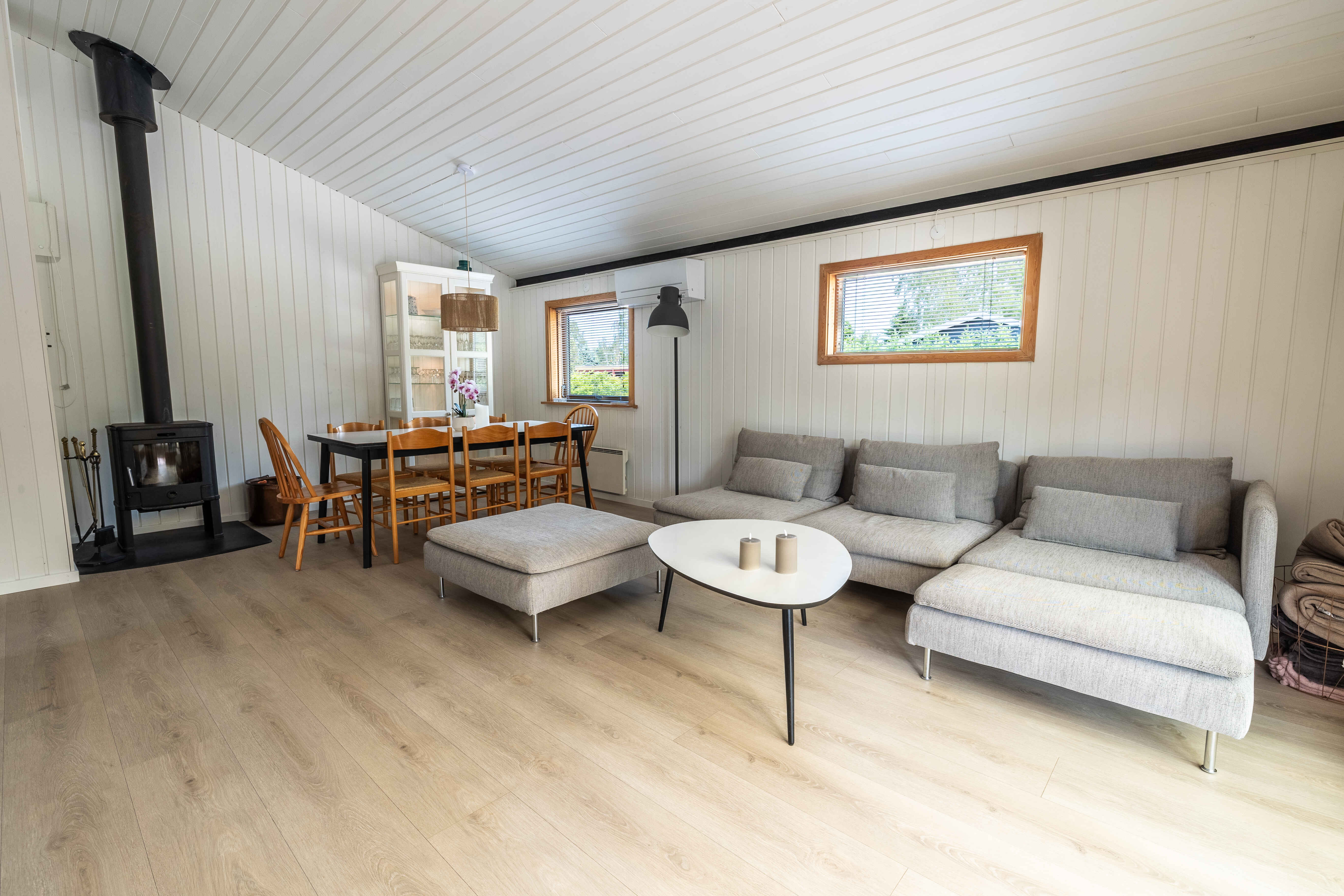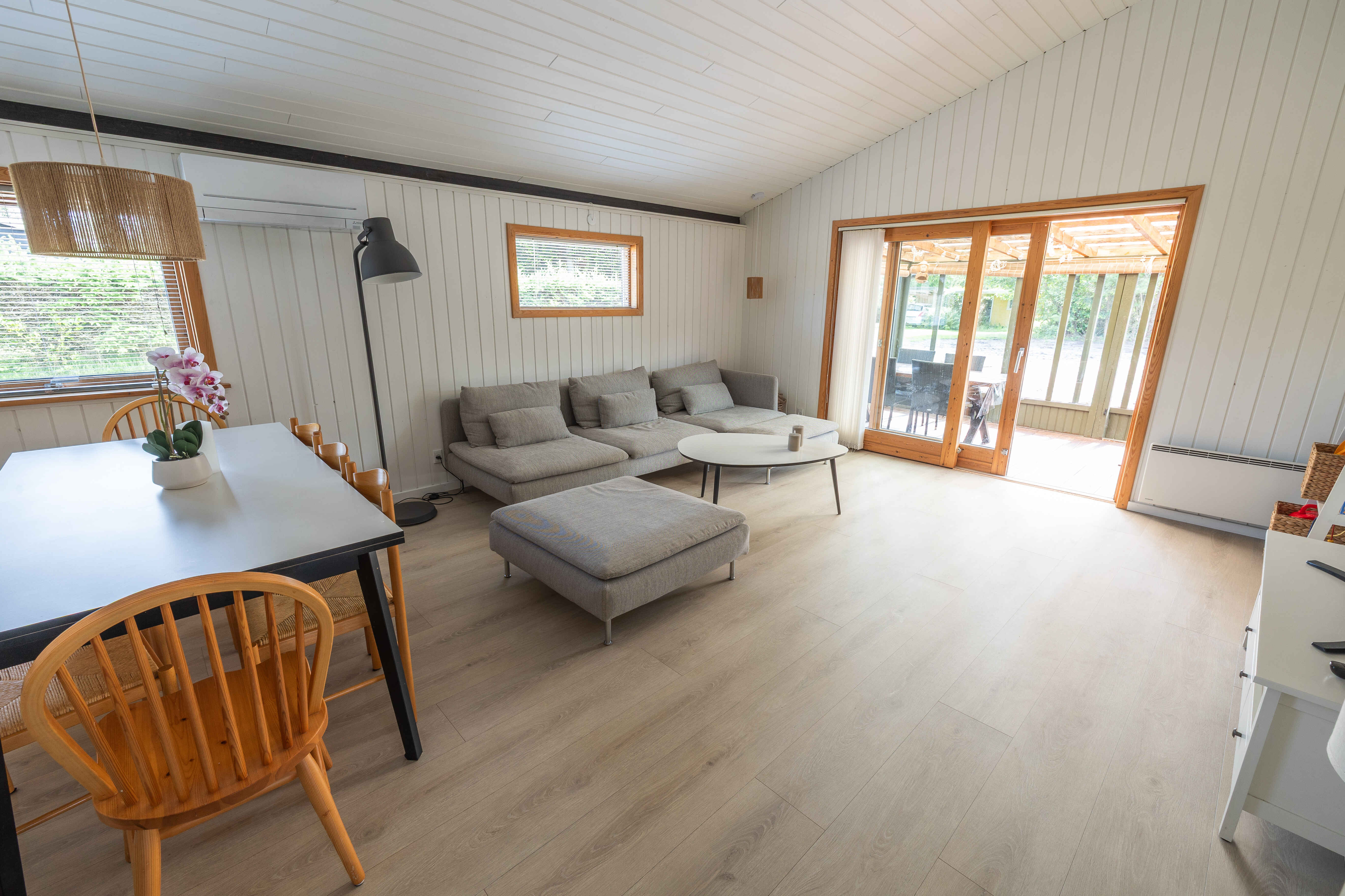 Der Grundriss ist einfach und funktional. Küche und Wohnzimmer sind offen verbunden und bieten Zugang zu einem überdachten Wintergarten sowie einer sonnigen Terrasse mit Essbereich. Der Wohnraum ist mit Kamin und Sitzgelegenheiten ausgestattet, die Küche bietet alles für Ferienalltag und Gemütlichkeit.