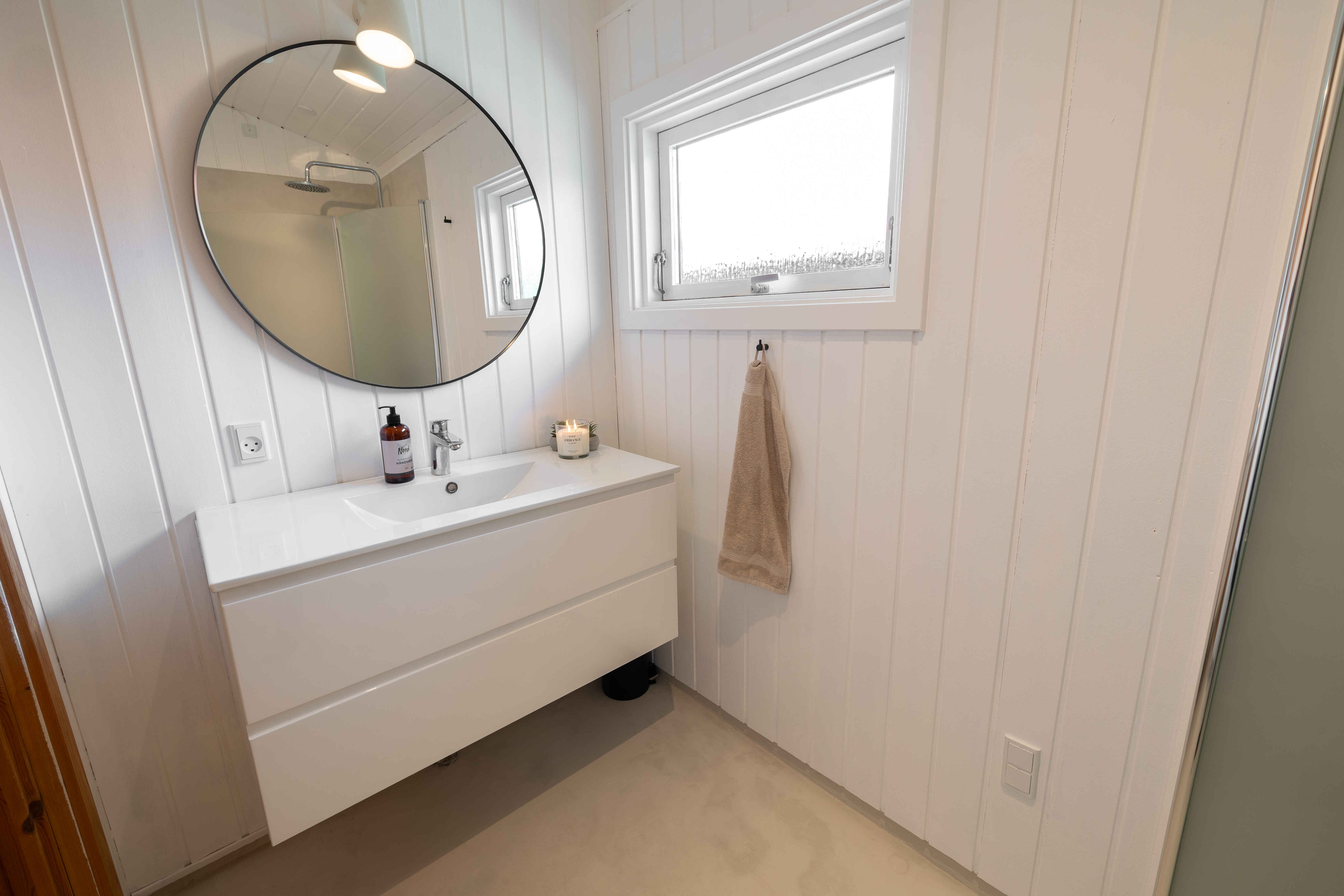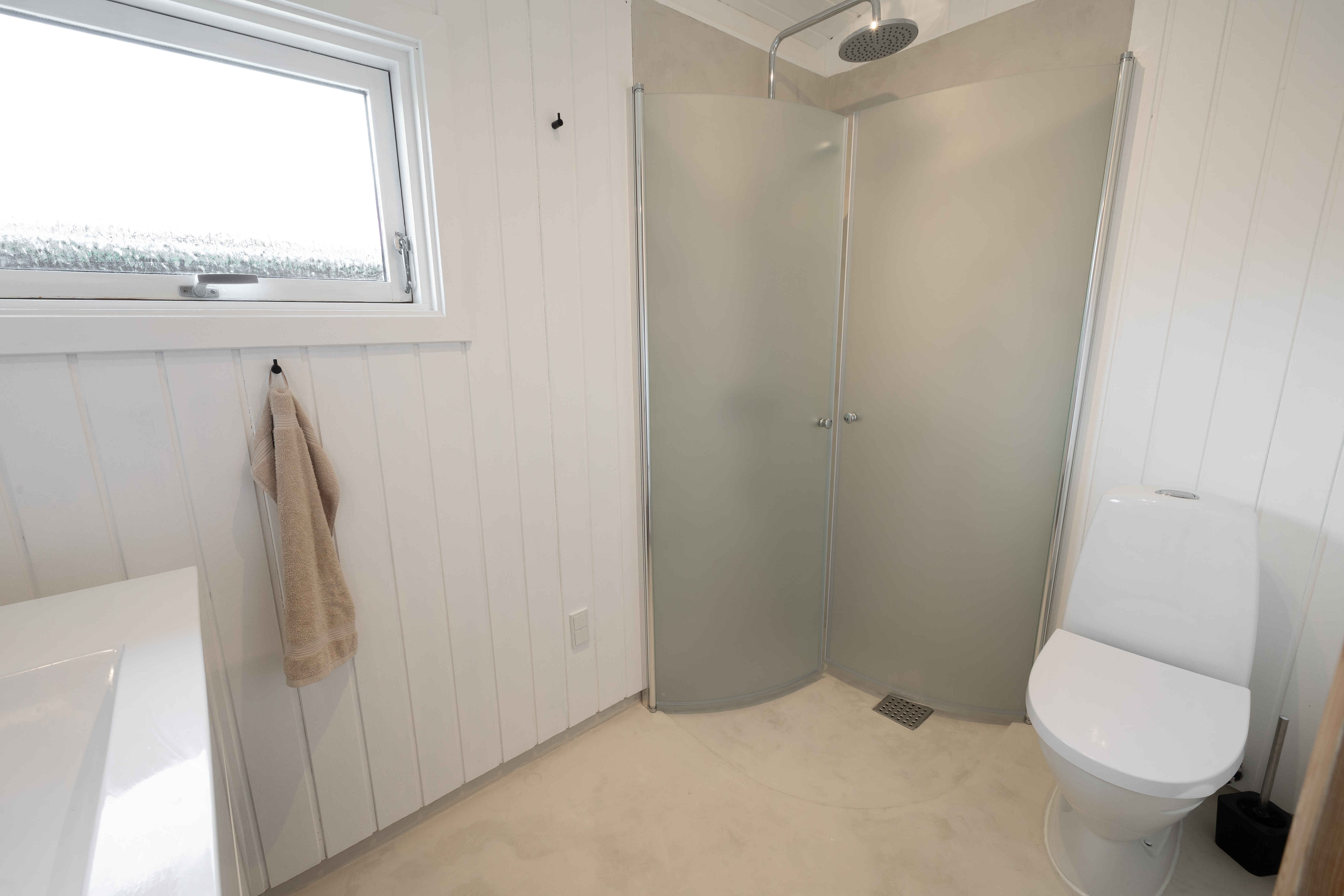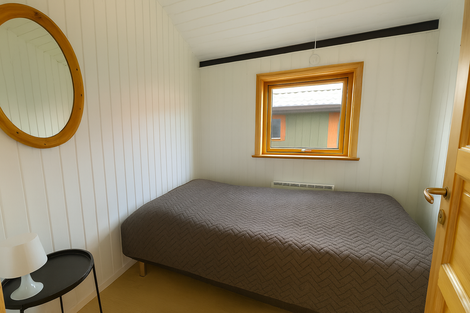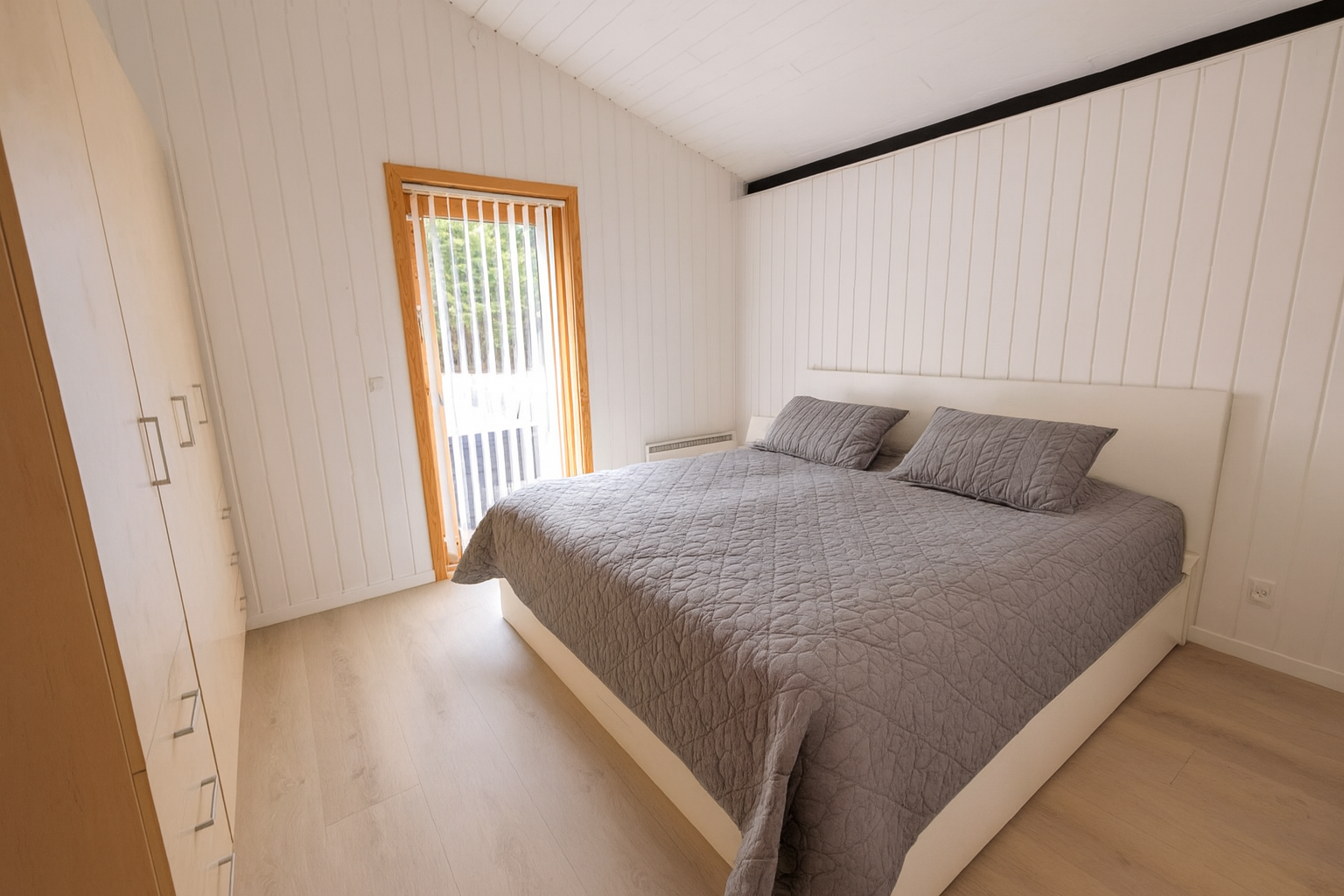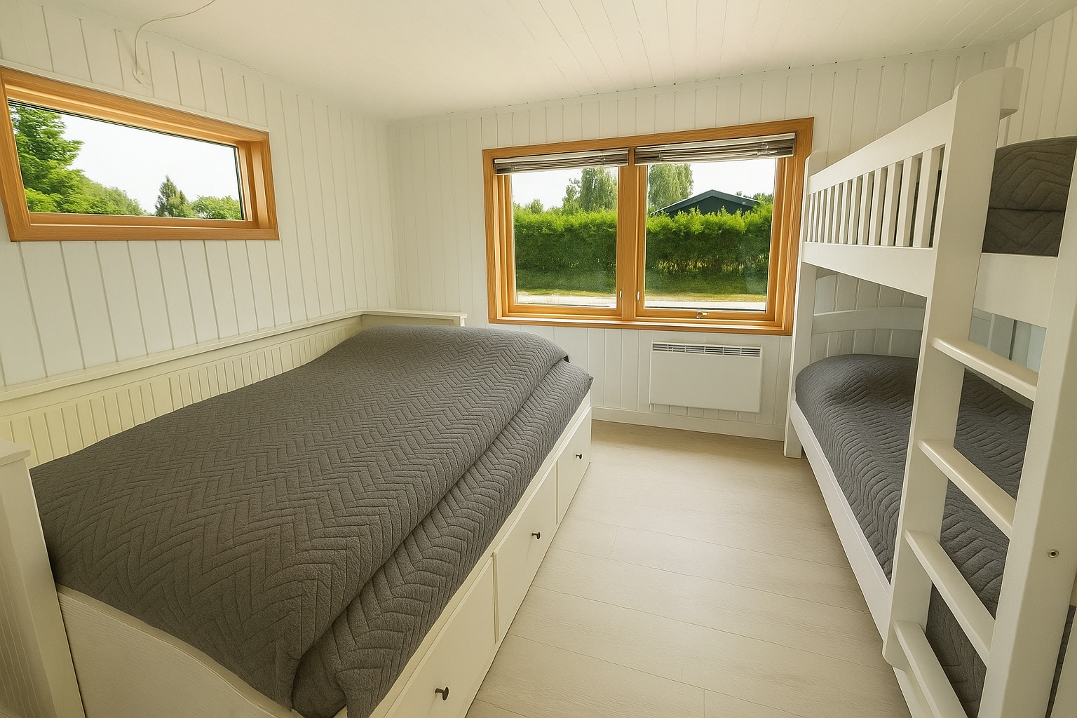 Drei separate Schlafzimmer – zwei mit Doppelbetten, eines mit Etagenbett und Doppelbetten. Das Haus verfügt über ein Badezimmer mit Dusche, Waschmaschine und Trockner. Eine praktische Unterkunft für gemeinsame Zeit oder erholsame Ruhe.