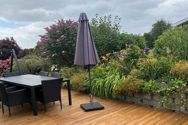 Ferienhaus auf Gartengrundstück mit großer, offener und überdachter Terrasse, auf denen Sie die Sonn...