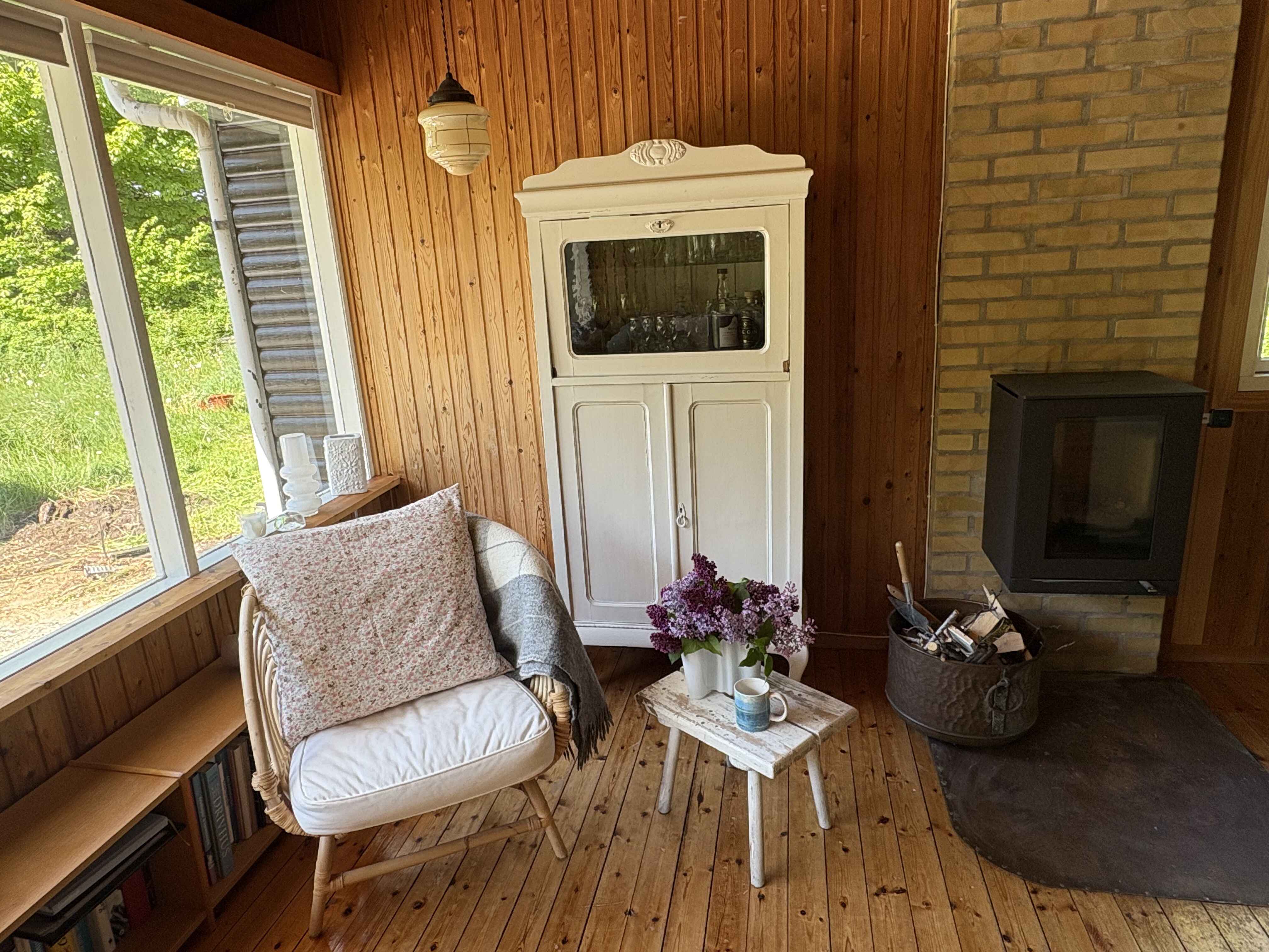 Ansprechendes, helles Wohnzimmer mit gemütlicher Sofaecke und Holzofen. Es gibt TV mit dänischen und...