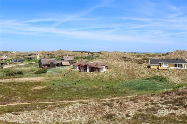 Ein schönes Ferienhaus mit toller Lage auf einem sehr großen und hügeligen Grundstück erwartet dich hier. Von der höchsten Stelle des Grundstücks hast du einen fantastischen Blick über das Dünengebiet, das Meer und den Fjord. Zum Haus führen ein paar Treppenstufen hinauf.