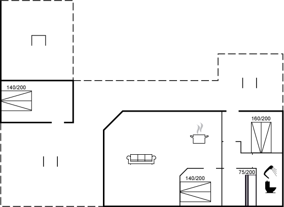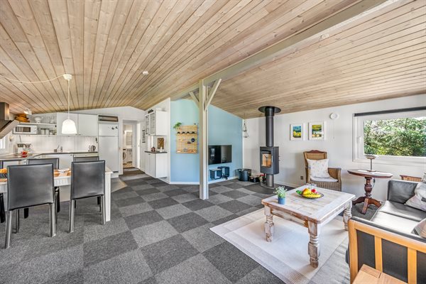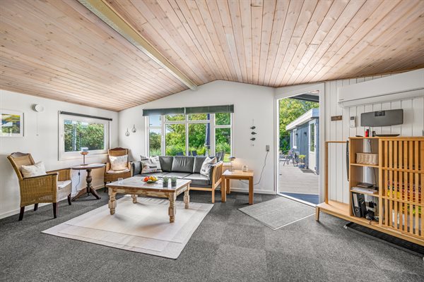 Das Sofa lädt zum Entspannen ein – mit dem Knistern des Kaminofens im Hintergrund. Zum Ferienhaus gehört auch ein gemütliches Gästehaus mit Doppelbett und viel Platz. Es ist der perfekte Ort für Teenager oder auch ein idealer Rückzugsort mit einem guten Buch, wenn du mal eine kleine Pause vom Beisammensein brauchst.