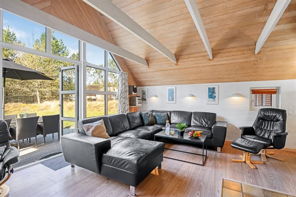 Ein schönes und gepflegtes, 2-stöckiges Ferienhaus aus Stein mit Reetdach und Swimmingpool. Das Ferienhaus liegt auf einem Naturgrundstück in einem beliebten Feriengebiet zwischen Henne Strand und Bjerregaard Strand. Große offene Terrasse mit diversen Gartenmöbeln. Das Ferienhaus ist hell eingerichtet mit weiß gestrichenen Wänden und hell gebeizten Decken. Praktische Klinkerböden im Erdgeschoss, jedoch Holzboden im Wohnzimmer und Teppichböden in den Schlafzimmern. Holzböden überall im Obergeschoss.