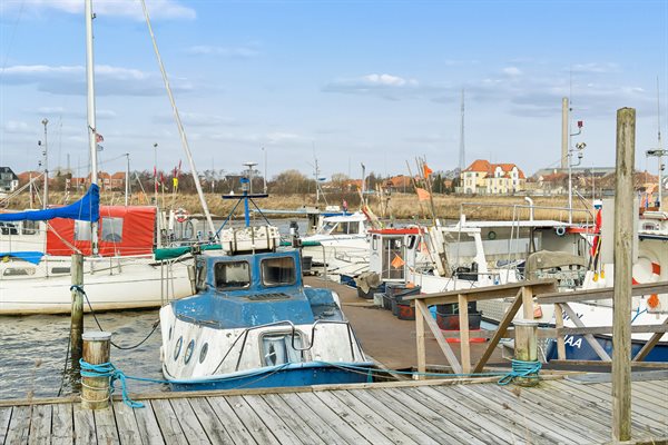Freie Terrasse mit Blick über den Yachthafen. Gemütlich und charmant eingerichtet mit einer gut ausgestatteten Küche im Erdgeschoss sowie einem warmen und hellen Wohnzimmer im Obergeschoss.