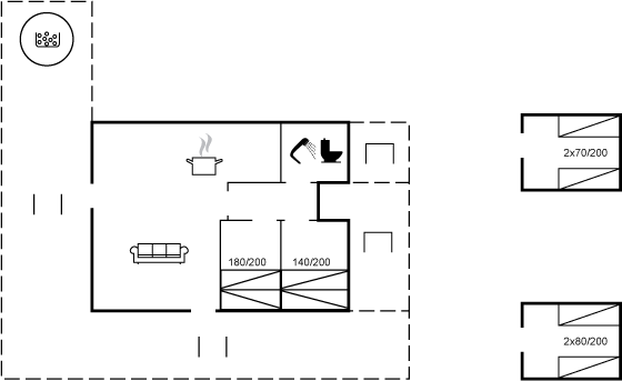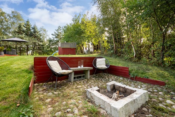 Das Ferienhaus verfügt über einen Eingangsbereich mit zwei Schlafzimmern und Bad/WC. Küche, Esszimmer und das Wohnzimmer mit Kaminofen befinden sich in einem offenen Bereich. Vom Wohnzimmer gelangst du auf die große Terrasse, teils überdacht, teils offen, wo dich einen Hot Tub erwartet, umgeben vom grünen Wald dahinter.