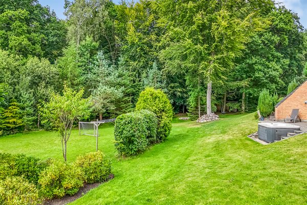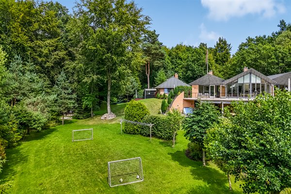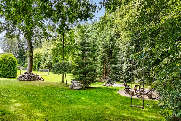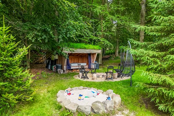 Zum Ferienhaus gehören eine offene sowie eine überdachte Terrasse. Auf dem Grundstück findest du eine Schaukel, einen Sandkasten, ein Trampolin, Fußballtore, eine Lagerfeuerstelle und eine Windschutzhütte. Außerdem stehen dir eine Außendusche und ein Grill zur Verfügung.