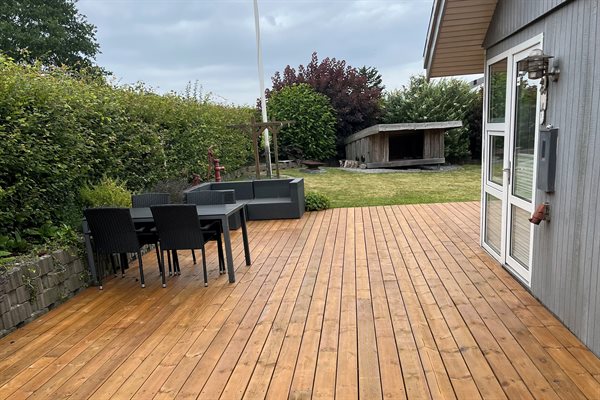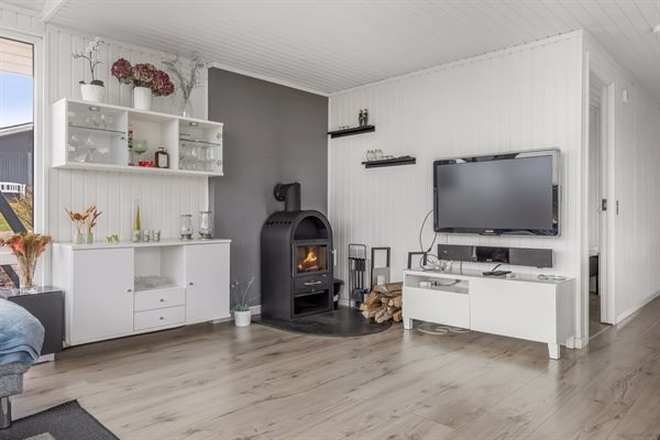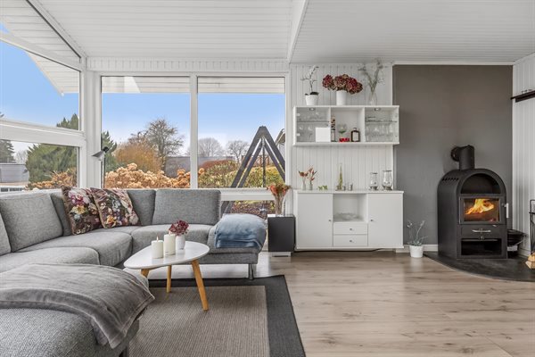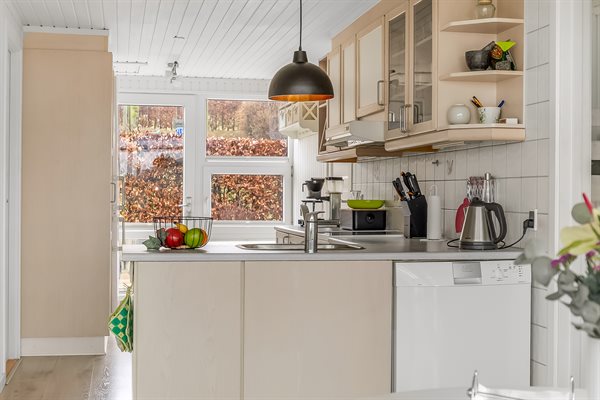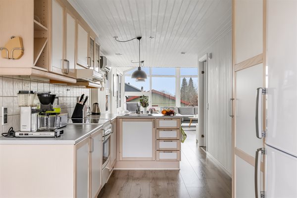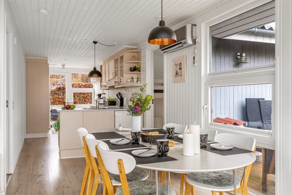 Mit diesem Ferienhaus findet ihr ein gemütliches, helles und in jeder Hinsicht herrliches Ferienhaus im beliebten Hejlsminde. Die einladende Wohnküche ist der natürliche Treffpunkt des Hauses und bildet den Rahmen für viele schöne gemeinsame Stunden – sei es beim gemeinsamen Kochen, bei Brettspielen oder beim Entspannen in guter Gesellschaft. Insgesamt ist die Wohnküche der Mittelpunkt des Hauses und zeichnet sich durch einen feinen Lichteinfall aus der großen Glasfront aus, die sich vom Boden bis zum offenen Dachgiebel erstreckt und den ganzen Tag über für gutes Tageslicht sorgt. Hier erlebt ihr ein ganz besonderes Raumgefühl, bei dem Innen- und Außenbereich harmonisch miteinander verschmelzen.