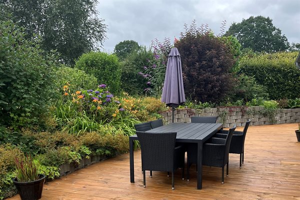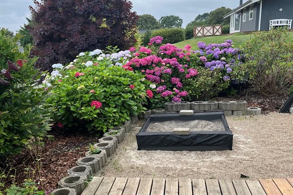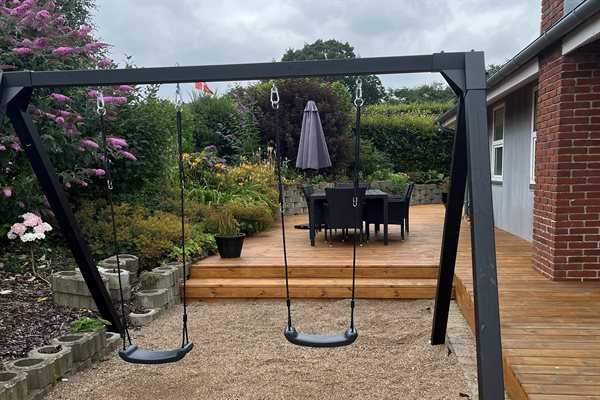 Es gibt auch einen schönen Außenbereich, wo die vielen Terrassen das Haus nahezu umgeben, und gute Möglichkeiten bieten, das Leben im Freien von morgens bis abends zu genießen. Hier findet ihr – je nach Bedarf – Windschutz, Sonne oder Schatten. Für die jüngsten Familienmitglieder gibt es sowohl eine Schaukel als auch einen Sandkasten. Und wenn ihr Lust auf eine Nacht unter freiem Himmel habt, könnt ihr die Windschutzhütte im Garten nutzen und beim Anblick der Flammen an der Feuerstelle den hereinbrechenden Abend genießen.