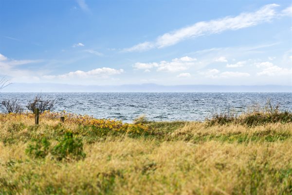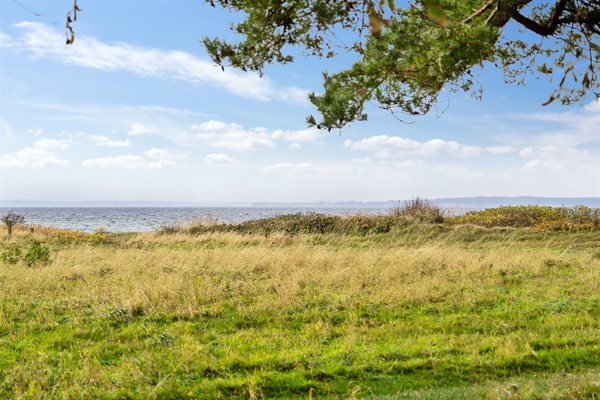 Ferienhaus nur 100 Meter von einem schönen Badestrand entfernt und mit Blick vom Haus und Grundstück auf das Wasser.