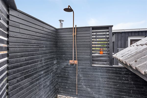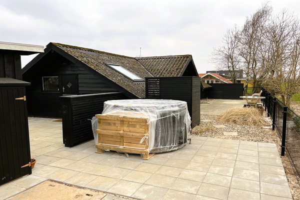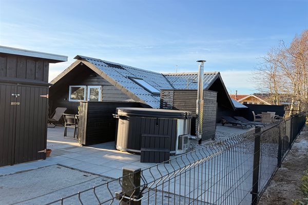 Hinter dem Haus befindet sich ein großes Terrassenareal. Dort gibt es unter anderem einen großen Hot Tub, der das ganze Jahr über nutzbar ist, sowie eine Außendusche im Sommerhalbjahr. Die Terrasse hinter dem Haus ist geschlossen, und von hier aus hast du Zugang zu einer Grünfläche, wo sich nur etwa 100 m vom Haus entfernt ein großer Spielplatz befindet.