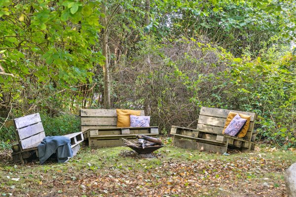 Auf dem 2013 Quadratmeter großen Grundstück, das von Bäumen und Bepflanzung umgeben ist, kann man ungestört verweilen, mit den Kindern spielen oder es sich am Lagerfeuer gemütlich machen. Für die Kinder gibt es mehrere Spielgeräte.