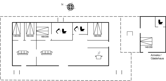 Das Haus ist 144 Quadratmeter groß und ideal für mehrere Familien. Du kannst das Haus aufteilen, indem du die Verbindung zwischen den beiden Wohnzimmern schließt, sodass sich an jedem Ende des Hauses zwei Schlafzimmer befinden. Außerdem gibt es ein großes, schönes Gästehaus mit Gästetoilette. Sowohl innen als auch außen findest du viel Platz für Gemütlichkeit und gemeinsames Beisammensein mit Familie und Freunden.