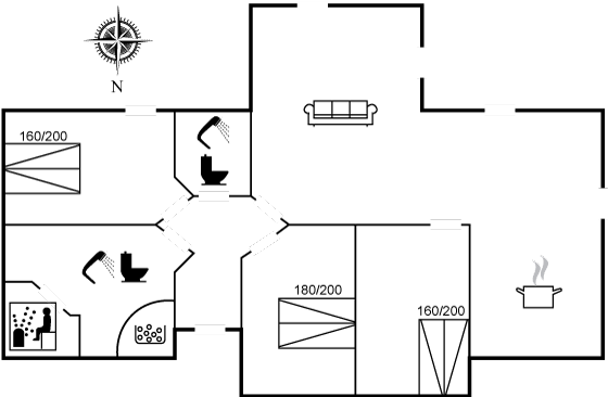 Das Haus besteht aus einem schönen Wohnküchenbereich mit großem Essplatz und offener Verbindung zum Wohnzimmer. Es gibt 3 Schlafzimmer mit jeweils 2 Schlafplätzen in Doppelbetten. Außerdem stehen euch 2 Badezimmer zur Verfügung, beide mit Duschnische und Fußbodenheizung. Im größten Badezimmer befinden sich zusätzlich ein Whirlpool, eine Sauna und eine Waschmaschine.