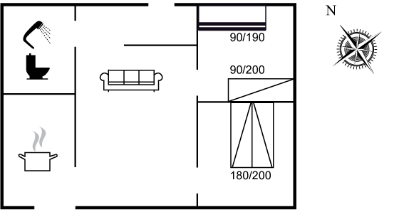 Der Mittelpunkt des Hauses ist die offene Küche, die mit dem Wohnzimmer kombiniert ist und direkten Zugang zur Terrasse bietet. Es gibt zwei Schlafzimmer: In dem einen Schlafzimmer, das mit 2 Betten eingerichtet ist, kannst du den Tag mit einem fantastischen Ausblick angehen lassen. Das andere Schlafzimmer verfügt über ein Etagenbett (90x190 cm, daher besonders für Kinder und Jugendliche geeignet) sowie ein Einzelbett. Das Badezimmer ist mit Duschnische und Fußbodenheizung ausgestattet.
