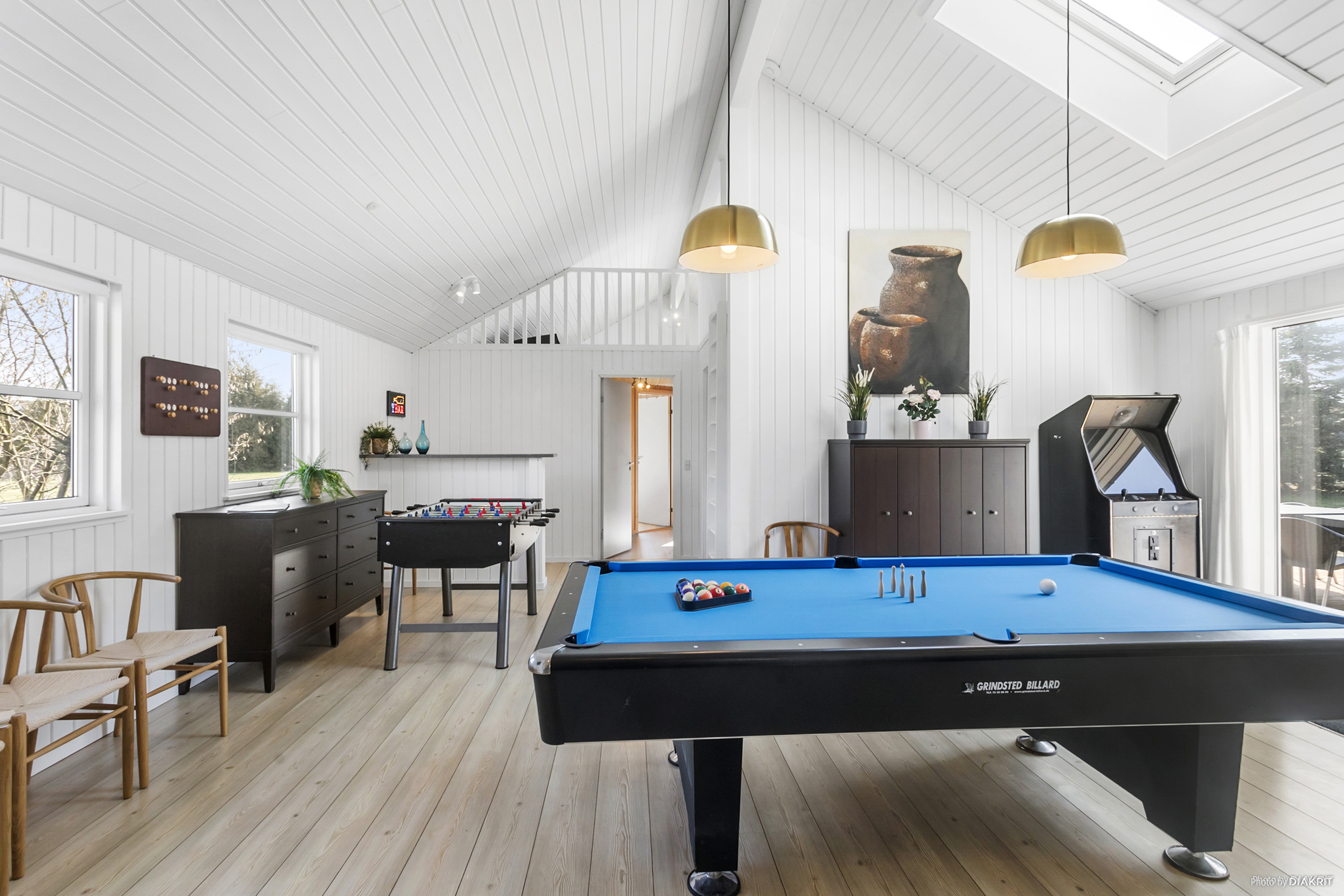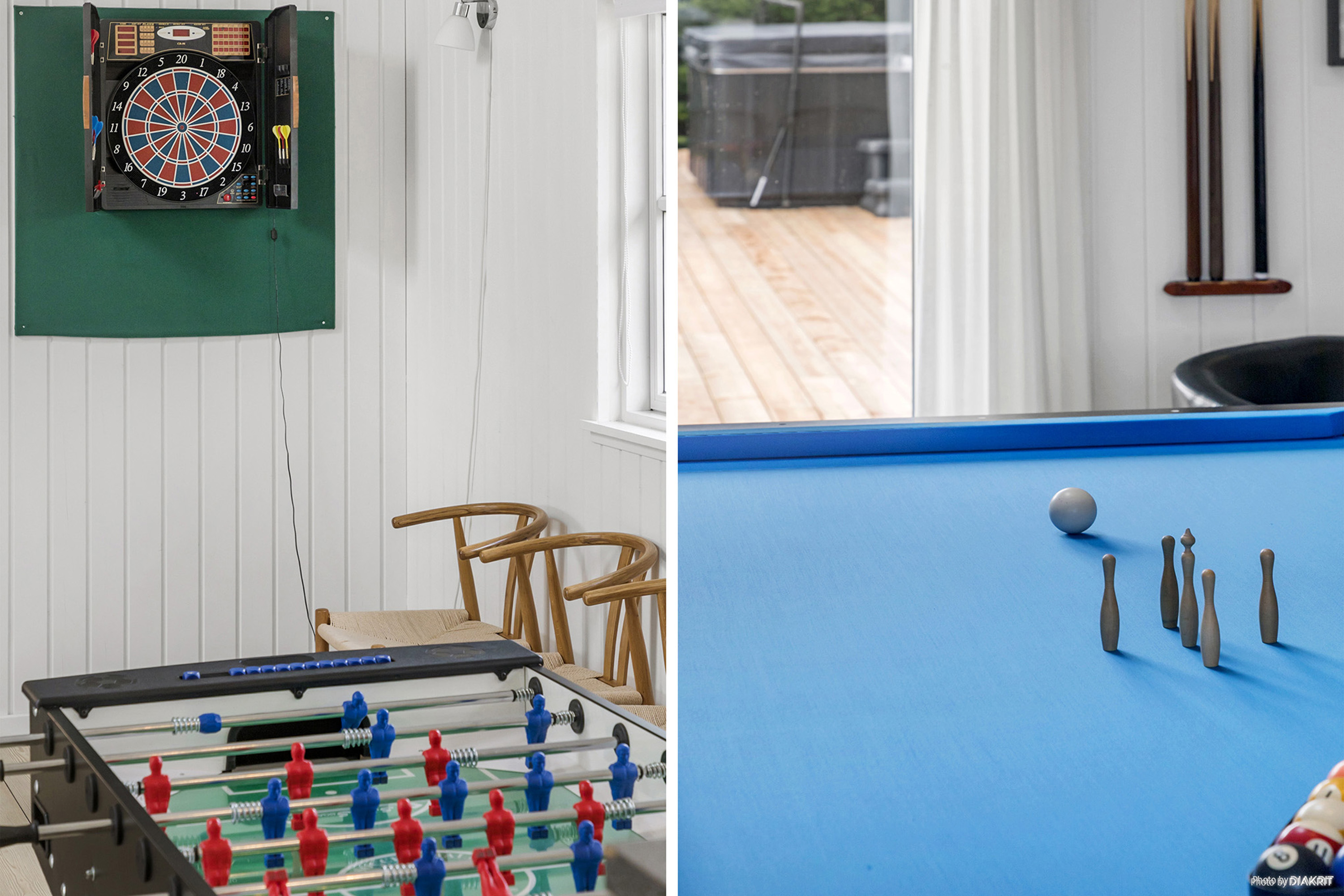 Dieses luxuriöse Poolhaus in der Nähe des charmanten Ortes Marielyst an der Ostsee bietet das ganze Jahr über ein einladendes Ambiente. Mit einem 18 m2 großen Swimmingpool, Wasserrutsche, Whirlpool und Sauna können Gäste ein umfassendes Wellness-Erlebnis genießen. Der Pool verfügt über eine Gegenstromanlage, die besonders bei jüngeren Gästen beliebt ist. Ein Aktivitätenraum mit Billard, Tischtennis, Kicker und Dart sowie DVD, Wii und Playstation 5 bietet Unterhaltung für alle Altersgruppen. Kostenloses WLAN ist ebenfalls vorhanden. Die gut ausgestattete Küche ist direkt mit dem Wohnzimmer verbunden, was besonders bei großen Gruppen geschätzt wird. Das Wohnzimmer bietet bequeme Möbel, einen Flachbildfernseher mit DVD-Player und einen Kamin für gemütliche Abende. Im Freien lädt die Terrasse mit Gartenmöbeln zum Entspannen und Grillen ein, während Kinder sich über Trampolin, Sandkasten und Schaukeln sowie das weitläufige Grundstück freuen können. \u00a0Bitte beachten Sie, dass dieses VillaVilla-Haus nicht an Jugendgruppen vermietet wird.