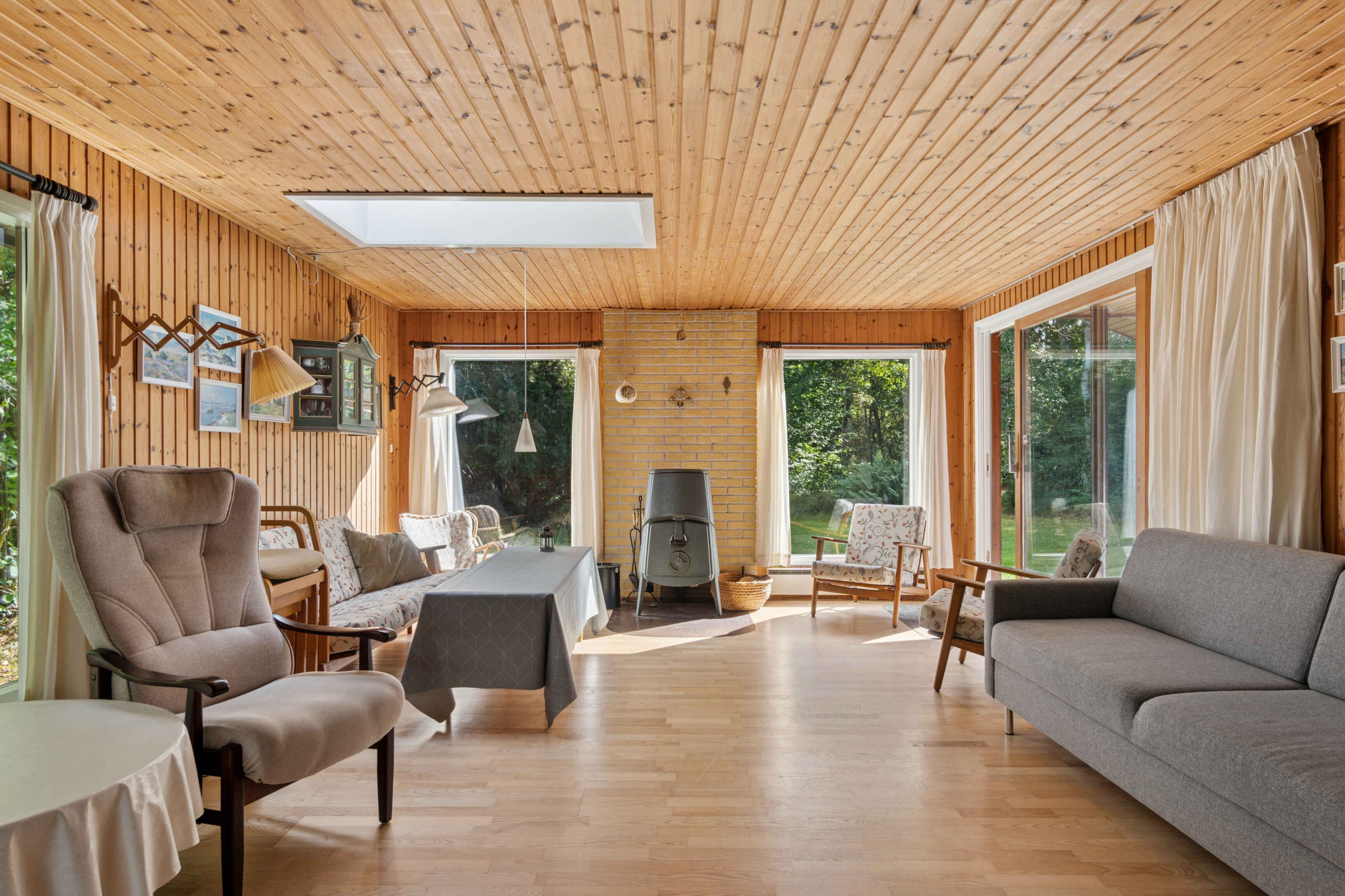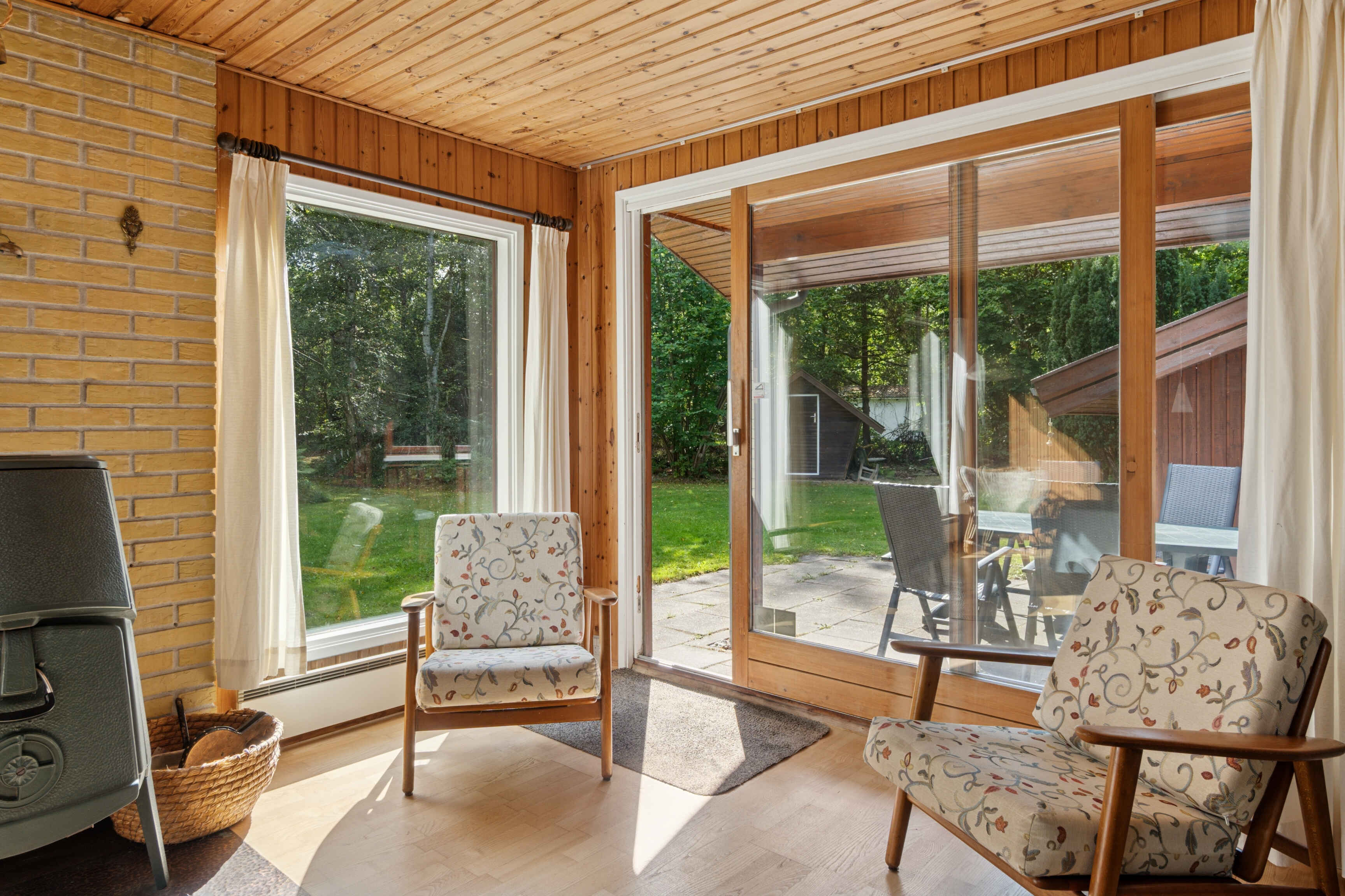 Das Wohnzimmer bildet das Herzstück des Hauses mit Kaminofen und großen Fenstern. Von hier aus gelangt man direkt auf die nach Süden ausgerichtete Terrasse, die sich ideal für Mahlzeiten und Entspannung im Freien eignet.