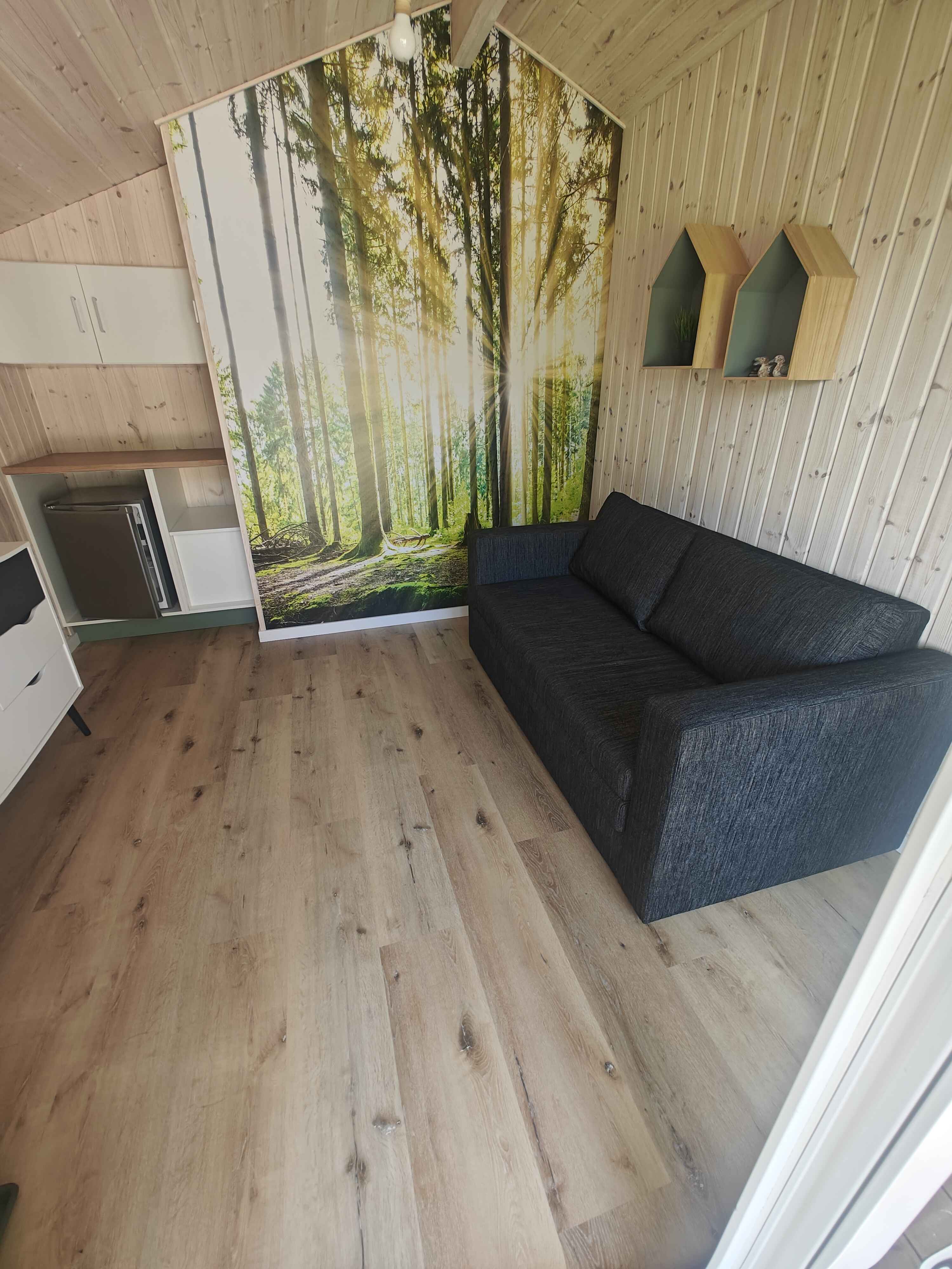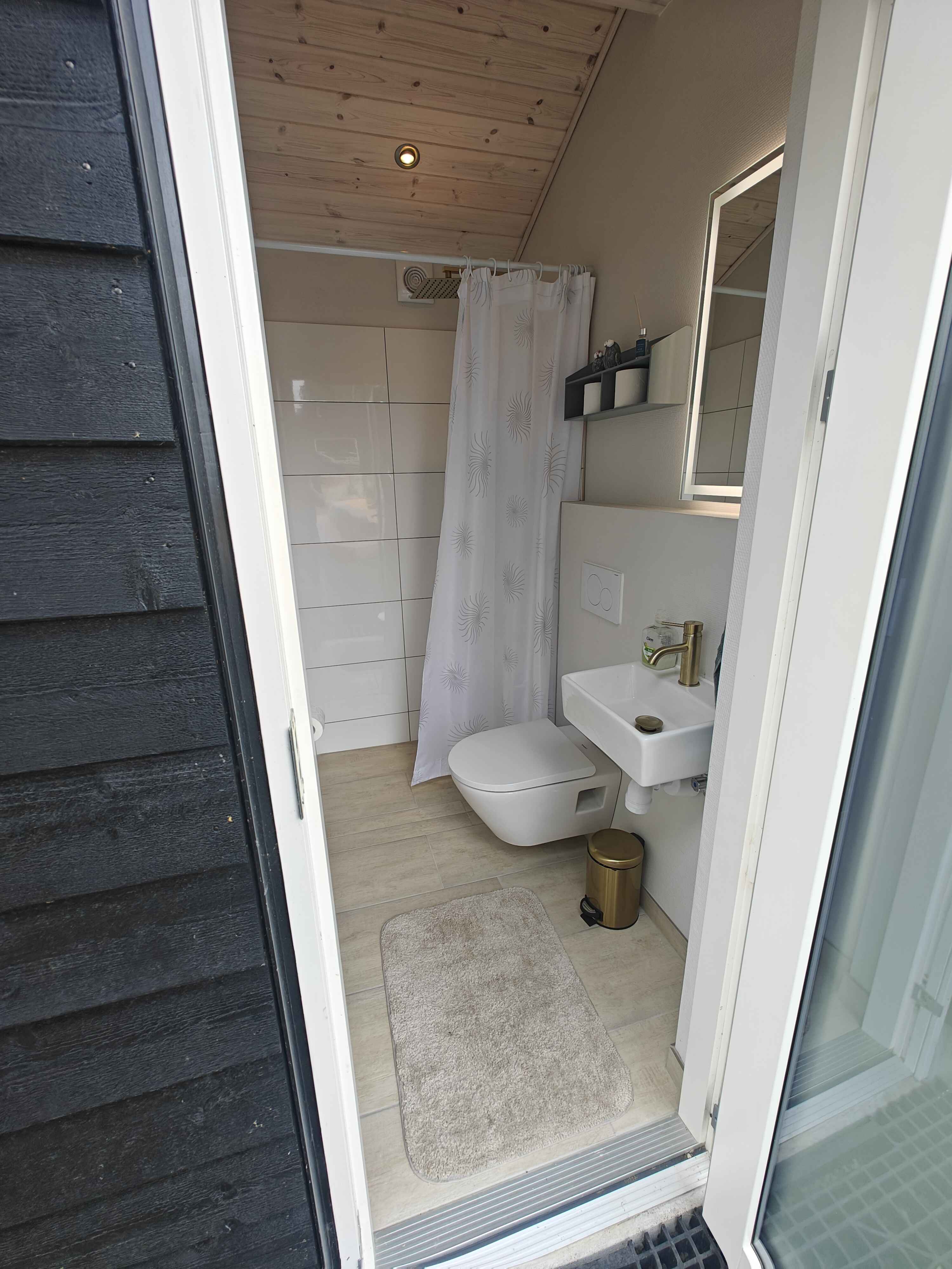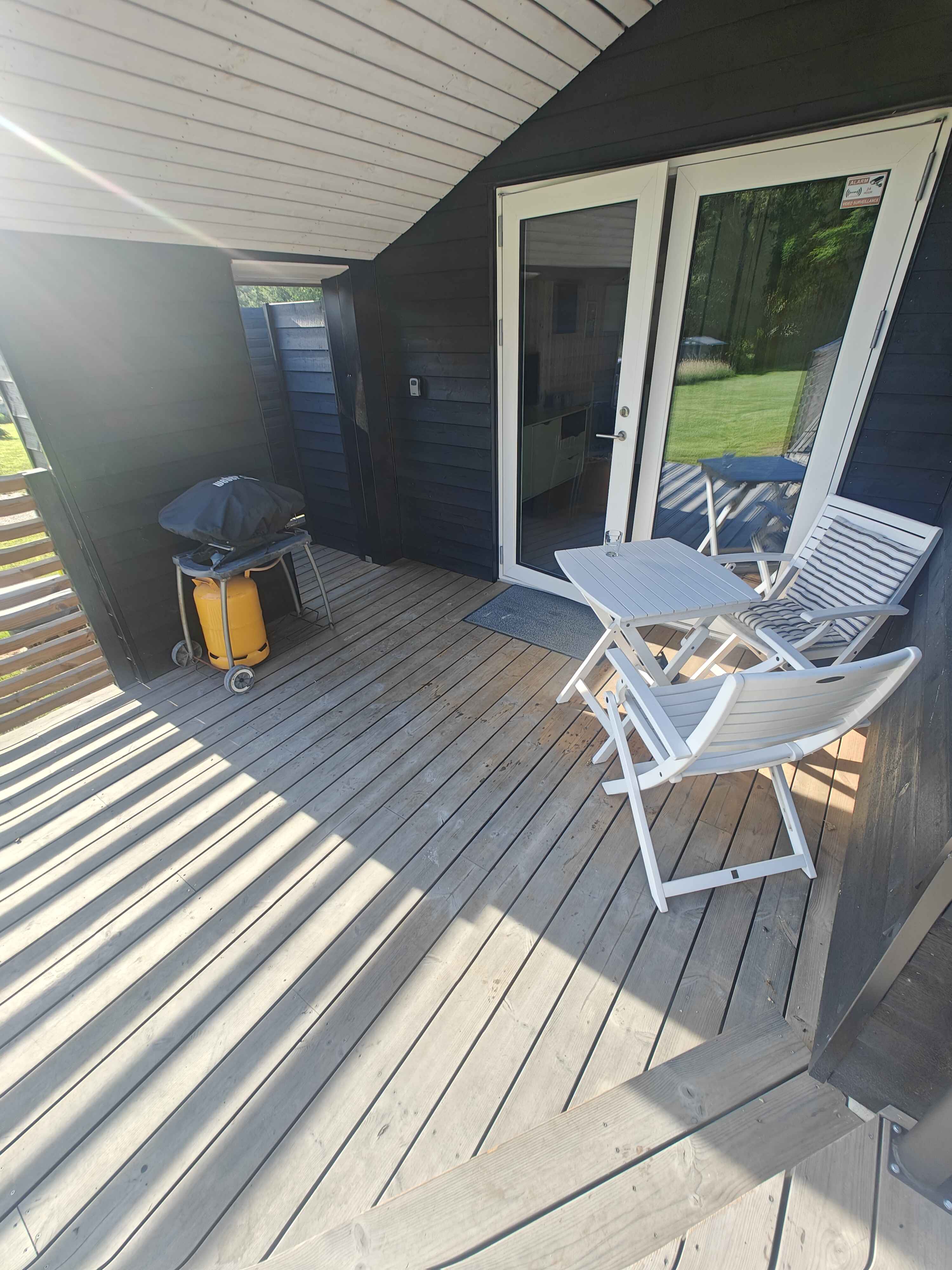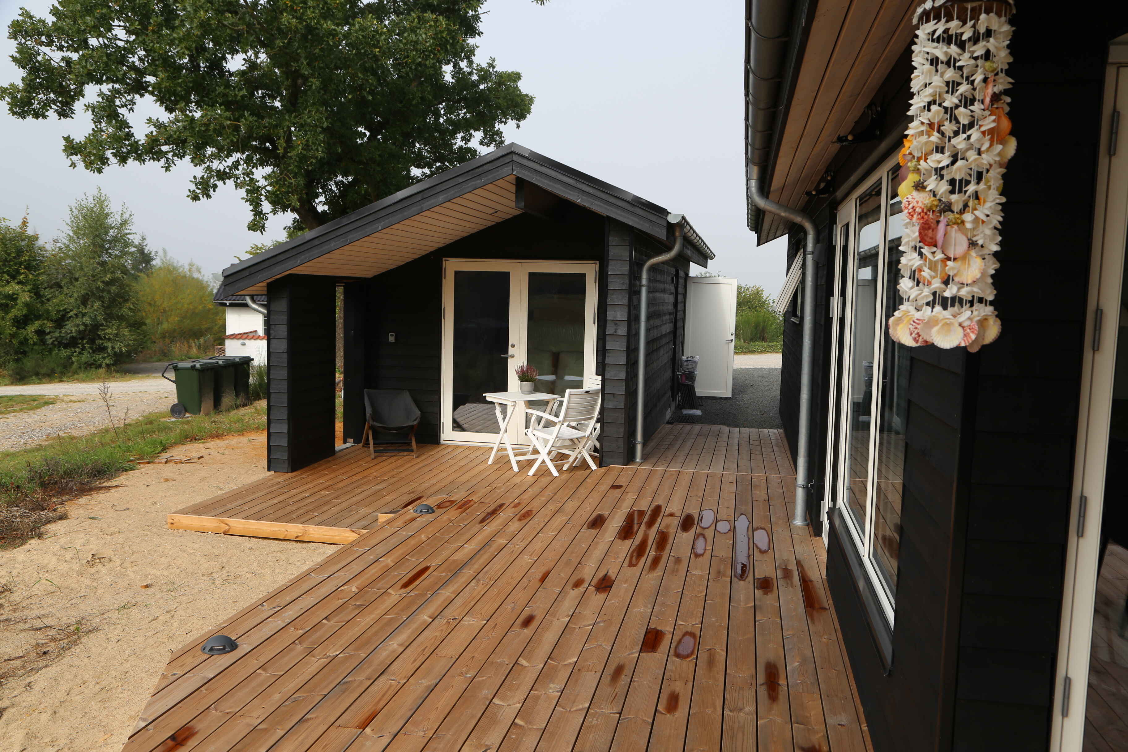 Im großen, hellen Zimmer des Anbaus mit hohen Decken gibt es viel Platz zum gemütlichen Spielen. Oder Sie öffnen die breiten Flügeltüren und holen die Natur direkt ins Zimmer. Das Zimmer ist stilvoll und mit viel Liebe zum Detail eingerichtet, was sich auch im luxuriösen Badezimmer mit seinen schönen Details widerspiegelt. Genießen Sie die Holzterrasse, die zum Sonnenbaden einlädt, oder suchen Sie sich ein schattiges Plätzchen unter der überdachten Terrasse. Die versetzten Fassaden bieten Ihnen je nach Bedarf Schutz, Schatten oder ein sonniges Plätzchen.