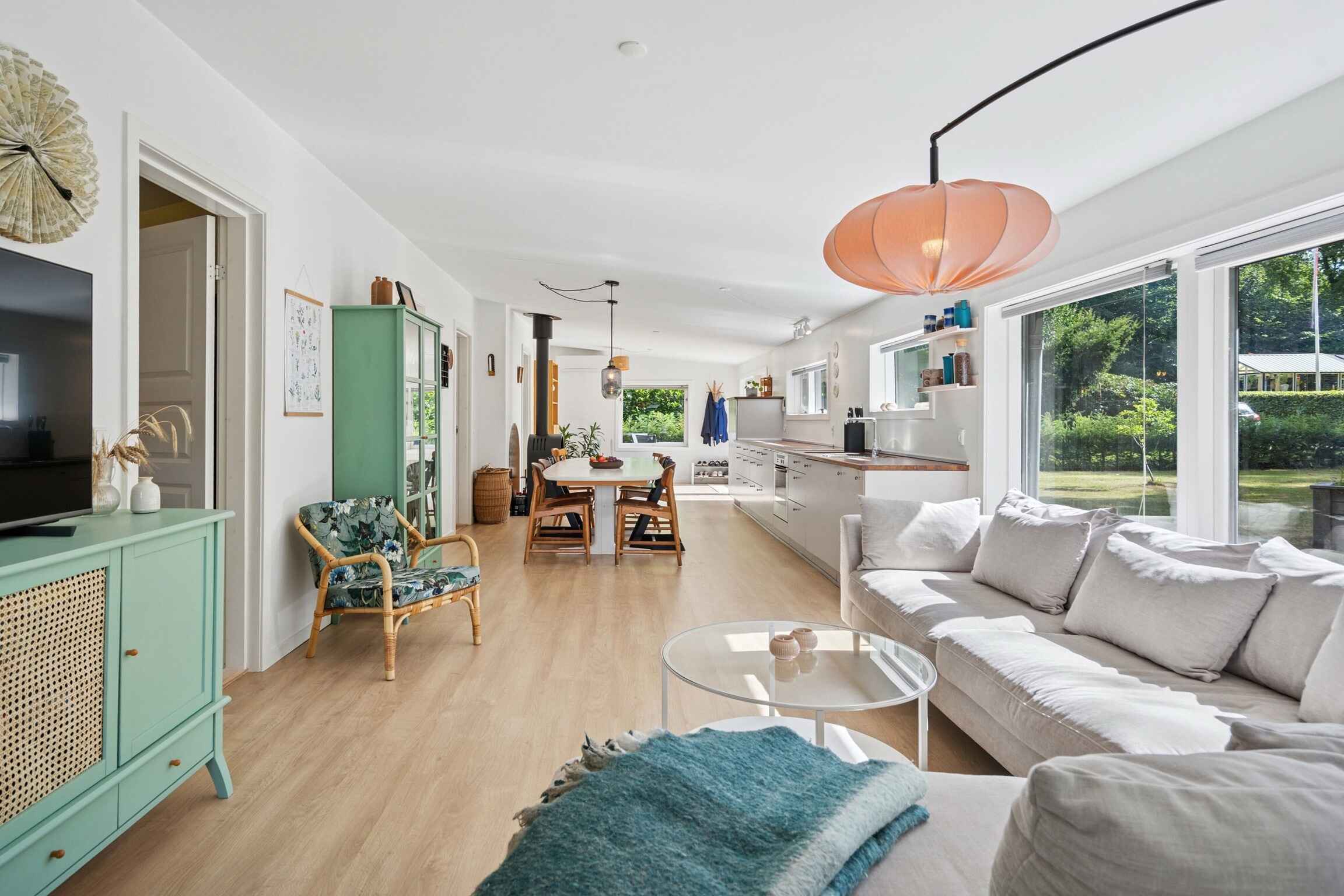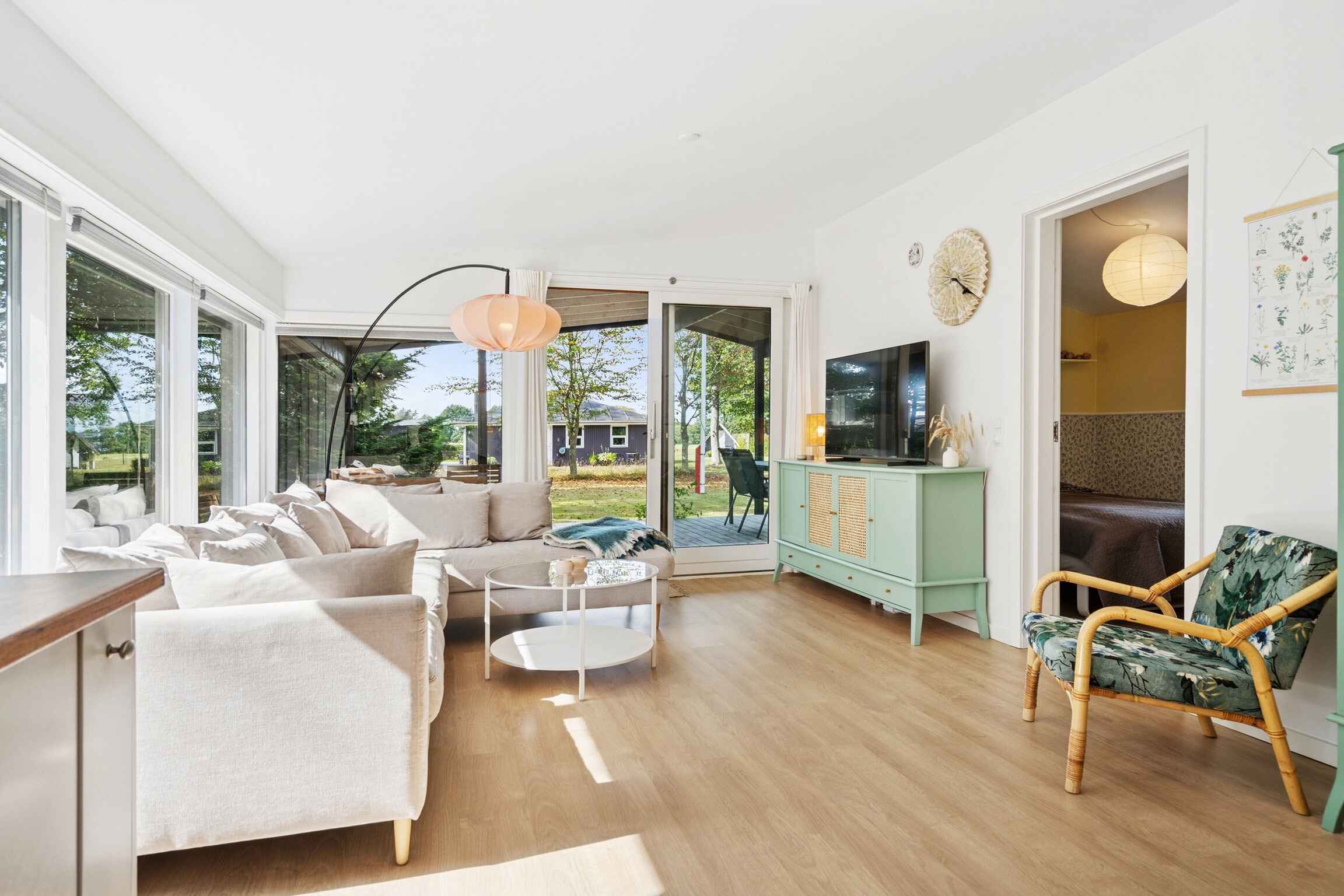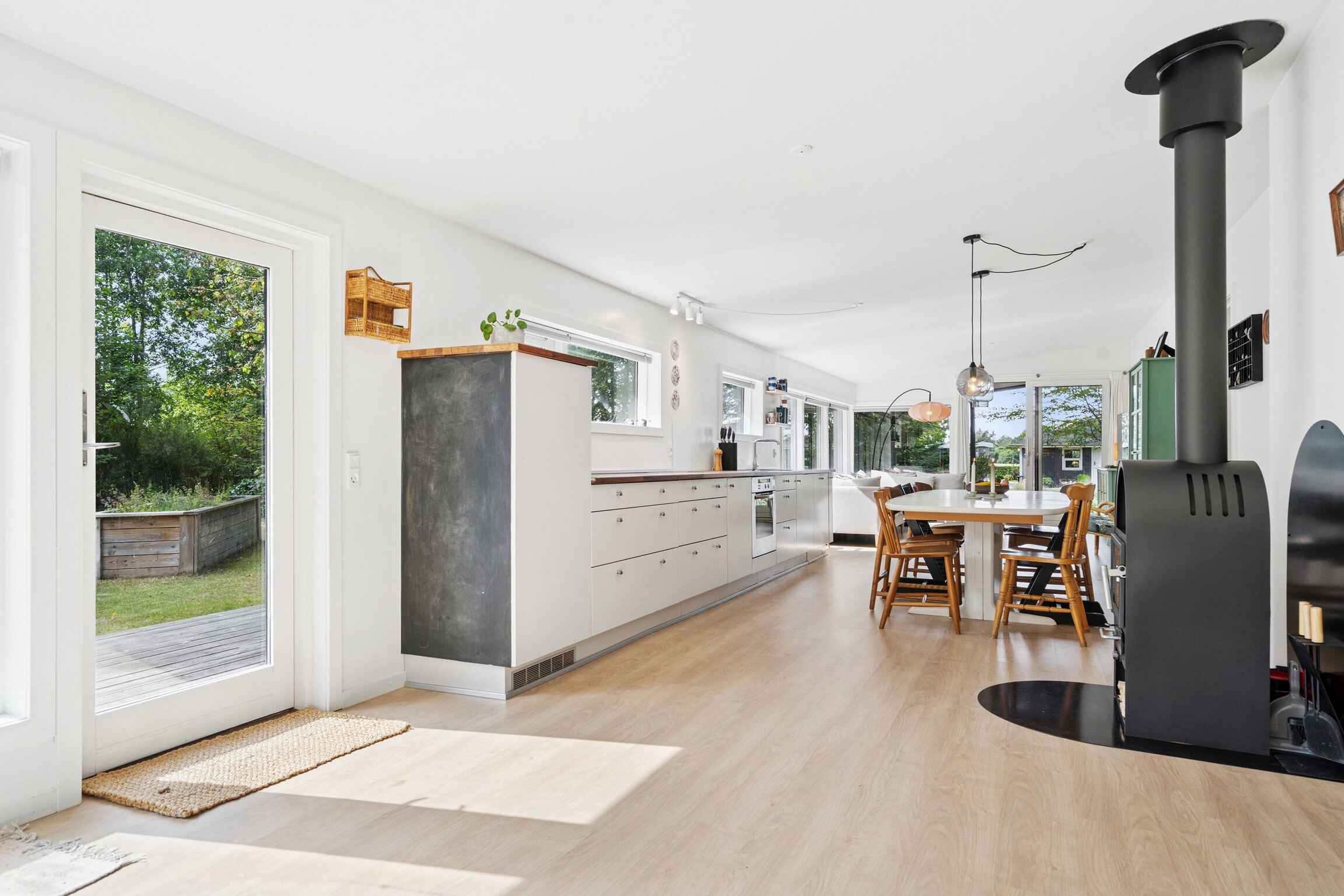 Das helle Wohnzimmer und die Küche sind natürlich verbunden und öffnen sich zur großen Holzterrasse, auf der Sie den ganzen Tag Sonne oder Schatten genießen können. Eines der Schlafzimmer hat direkten Zugang zur Terrasse, und der Anbau bietet flexible Möglichkeiten für Gäste oder größere Familien.