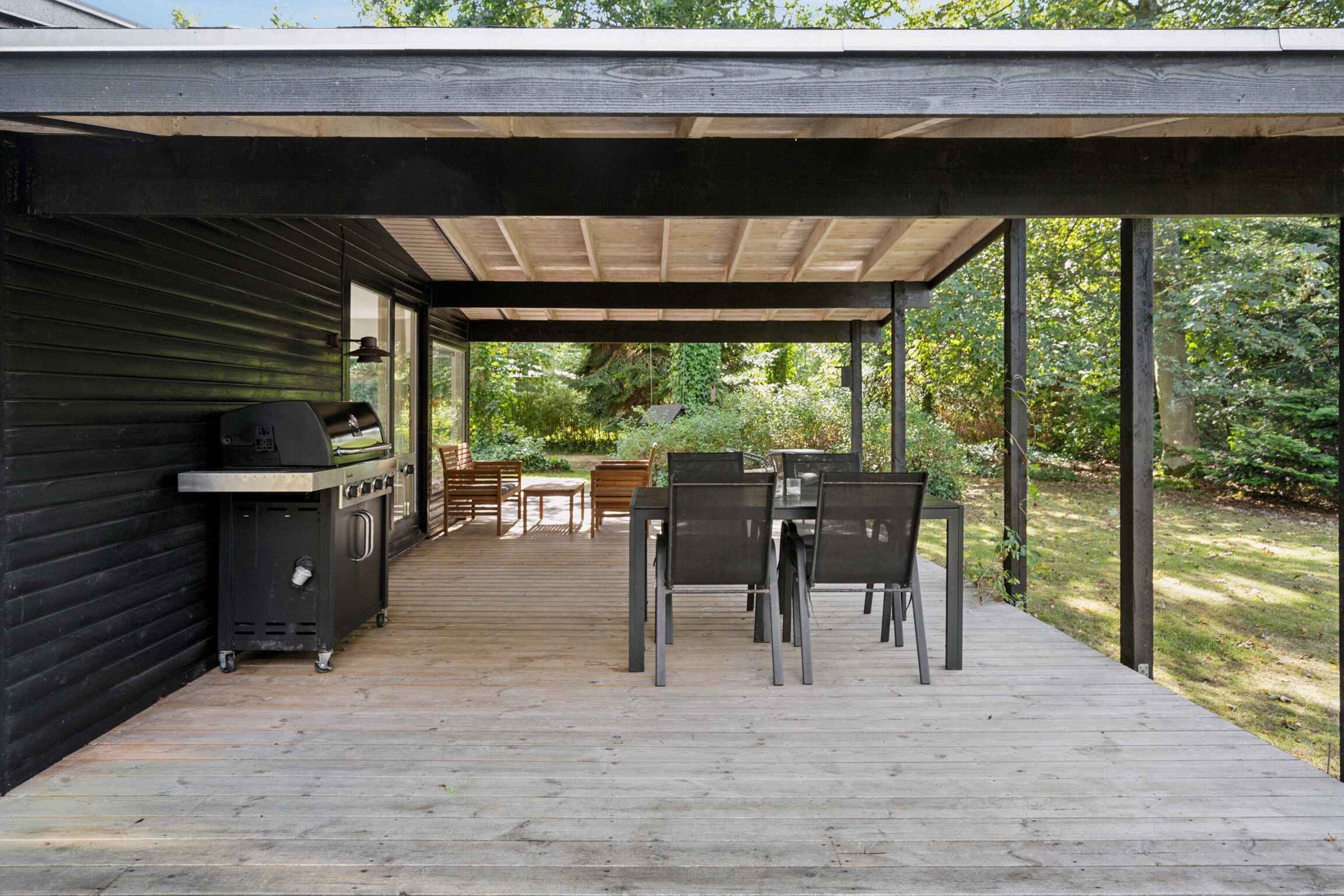 Die Terrasse schafft mehrere Außenbereiche für Morgenkaffee, Mittagessen im Schatten oder Abende im Außenwhirlpool. Der überdachte Bereich eignet sich ideal zum Grillen und für geselliges Beisammensein, während der Garten Platz für Spiel, Ruhe oder kleine Projekte bietet.