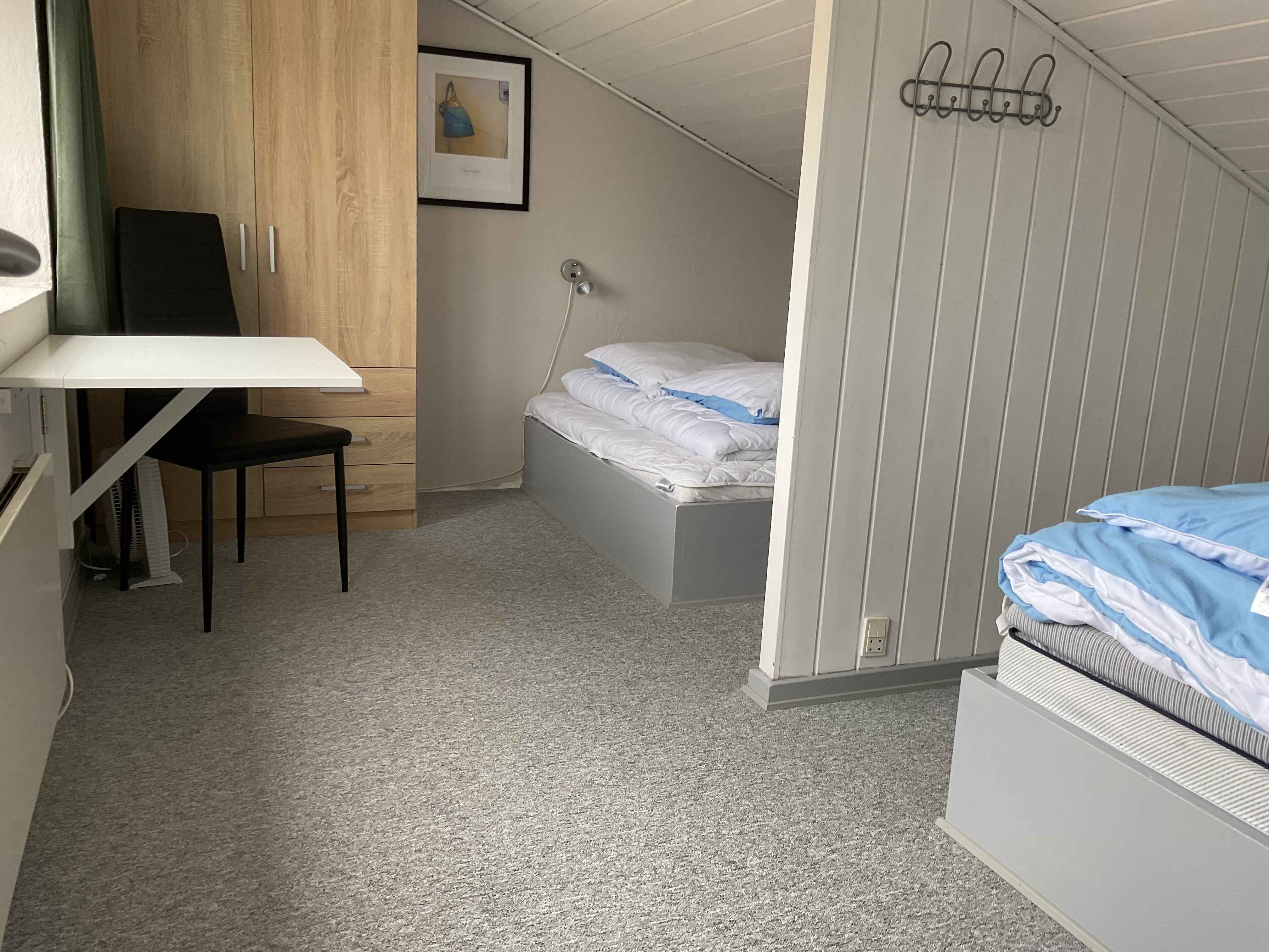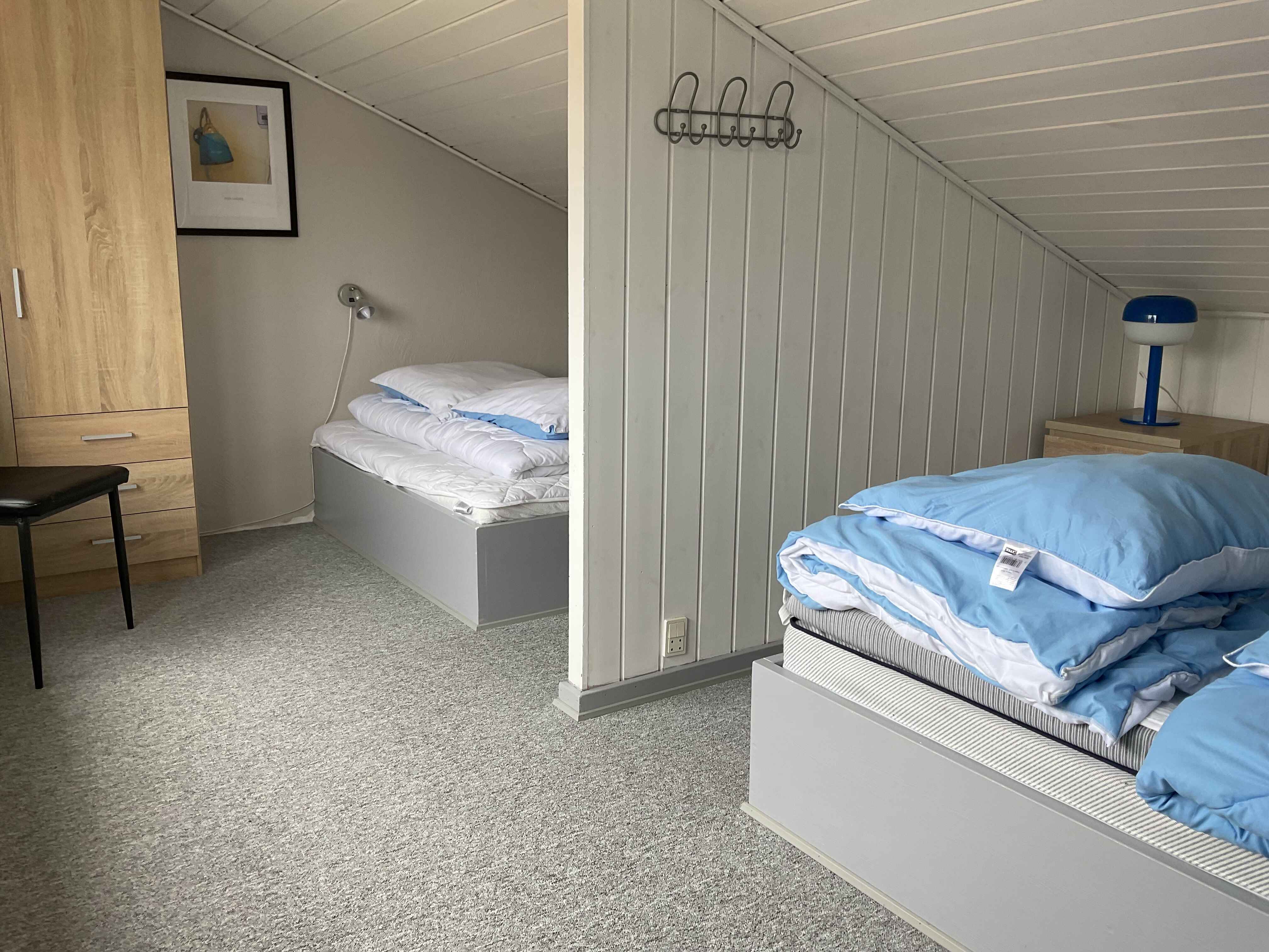 Im ersten Stock befindet sich ein Zimmer mit 1 großem Doppelbett und 2 Einzelbetten. Die Etage ist durch eine Wand getrennt und bietet etwas Privatsphäre.
