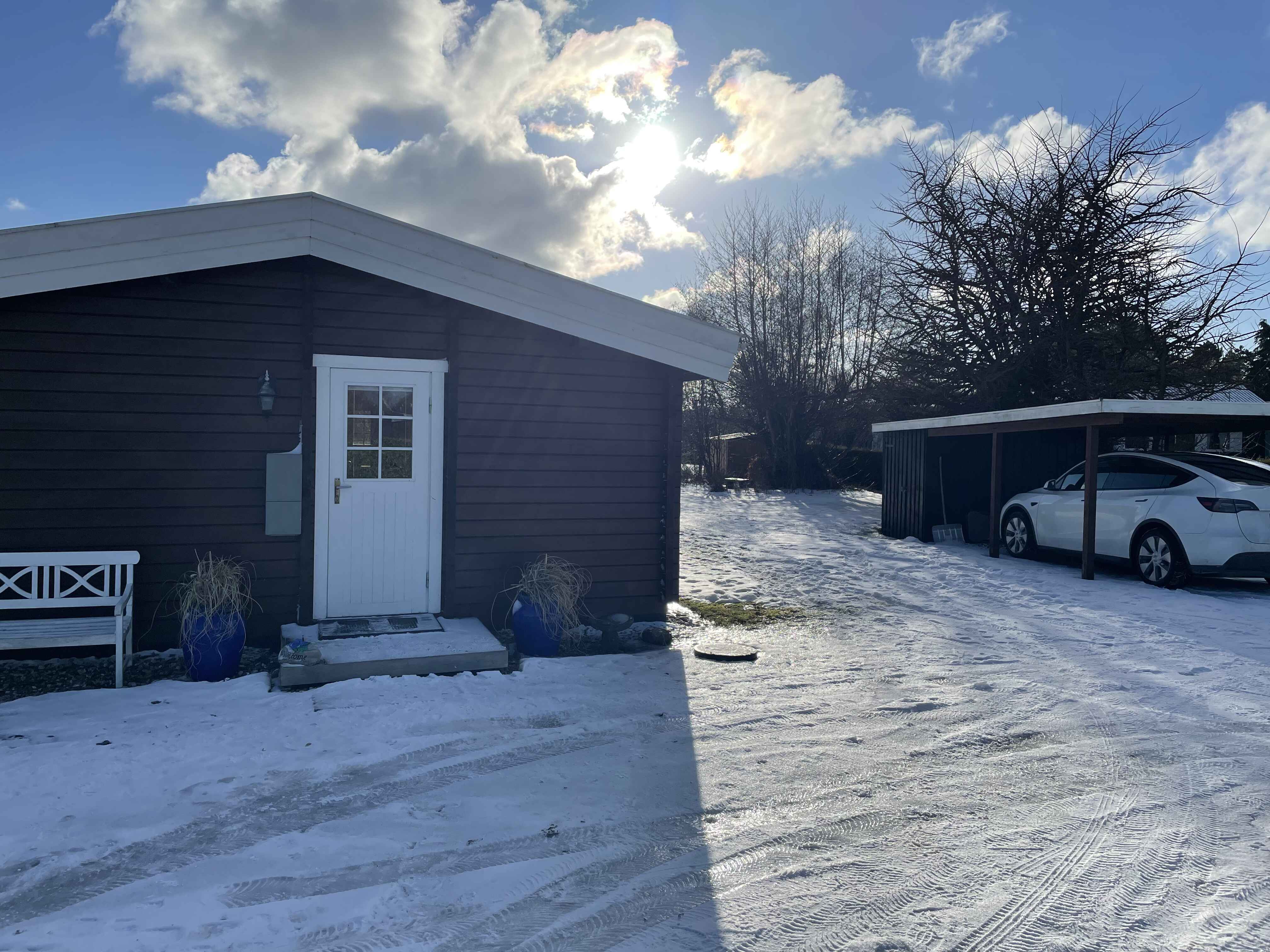 Vom Wohnzimmer aus gelangt man direkt auf die Veranda, wo Ruhe und Natur genossen werden können. Das Haus liegt ruhig am Ende einer Sackgasse auf einem stillen Grundstück.