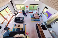 Im Wohnzimmer versammelt sich die Familie nach den Erlebnissen des Tages um den Kaminofen. Die Wärmepumpe sorgt das ganze Jahr über für ein angenehmes Raumklima. Die Internetverbindung macht es einfach, Ausflüge zu planen oder abends einen guten Film zu streamen.