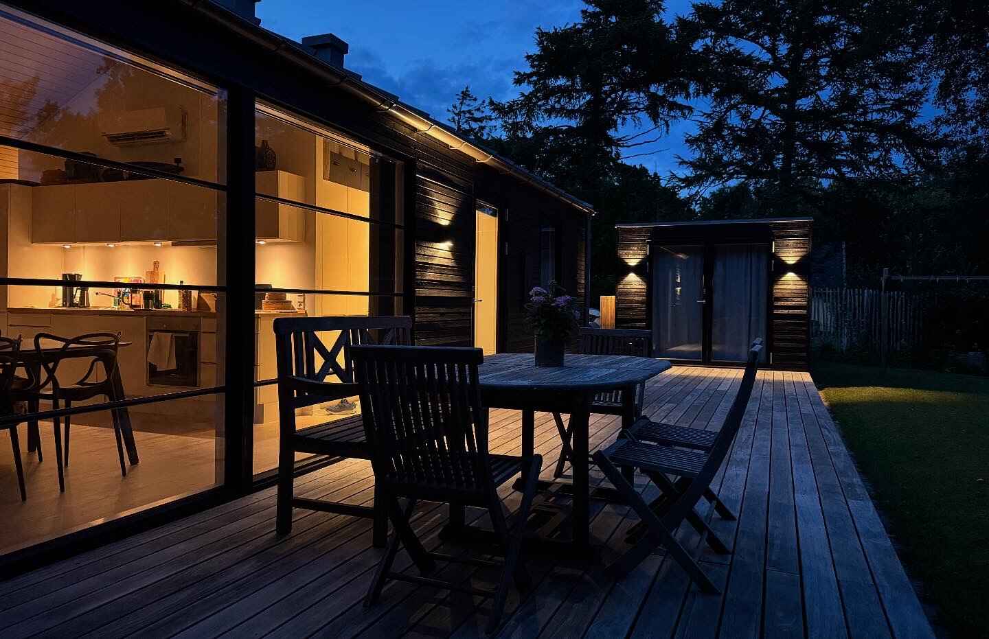 Das Wohnzimmer hat sowohl einen gemütlichen Essbereich als auch eine Sitzecke mit einem großen Sofa. Chromecast-TV und ein Hochstuhl sind ebenfalls vorhanden. Vom Wohnzimmer aus gelangt man auf die Terrasse. Es gibt ein Schlafzimmer mit einem Doppelbett und ein Zimmer mit einem Einzelbett und einer zusätzlichen Schlafgelegenheit. Außerdem gibt es eine Galerie mit einem Einzelbett. Schließlich gibt es ein nahegelegenes Annex mit direktem Zugang zur Terrasse und zwei Schlafplätzen, sodass die Schlafmöglichkeiten recht flexibel sind.
