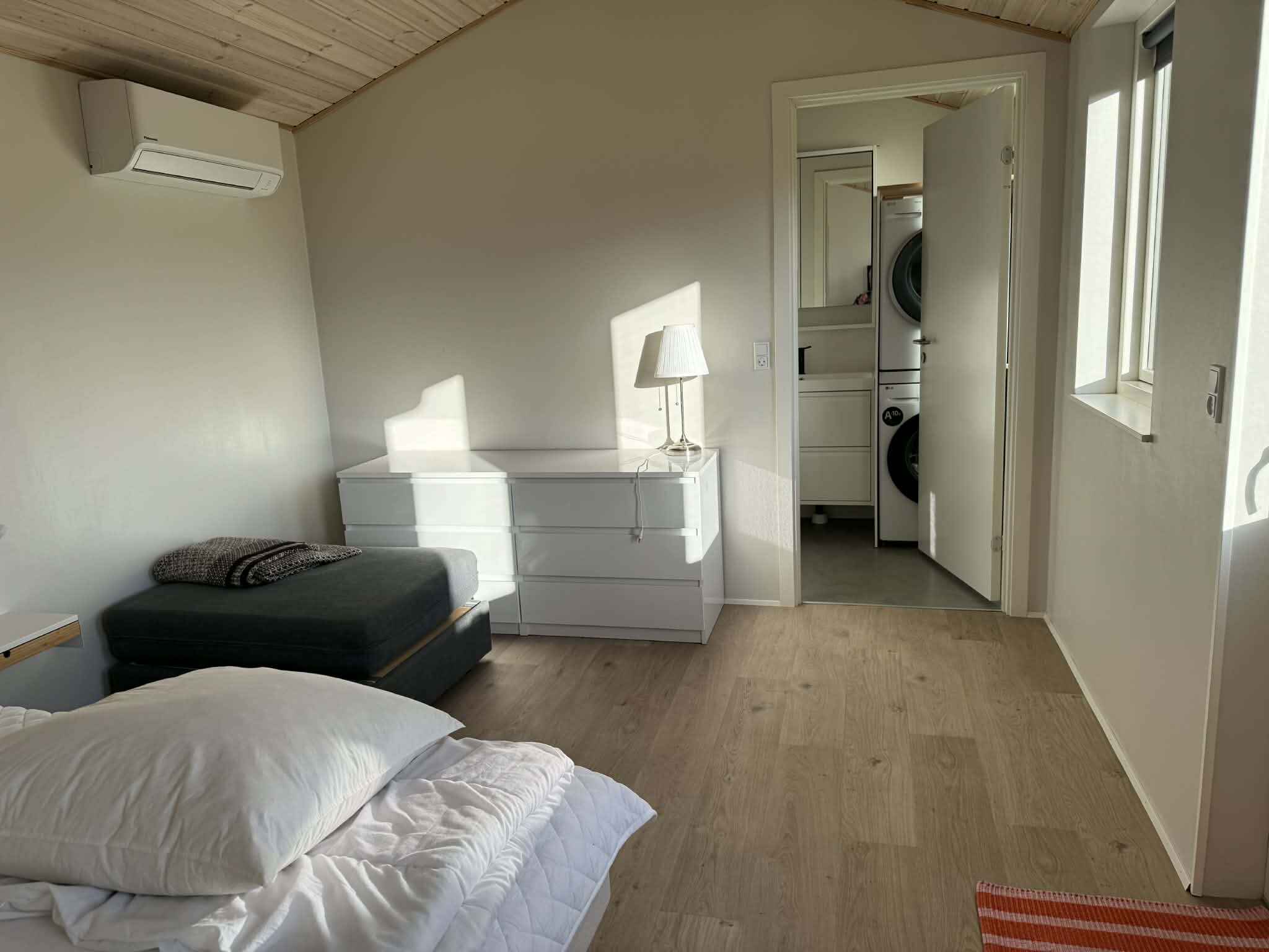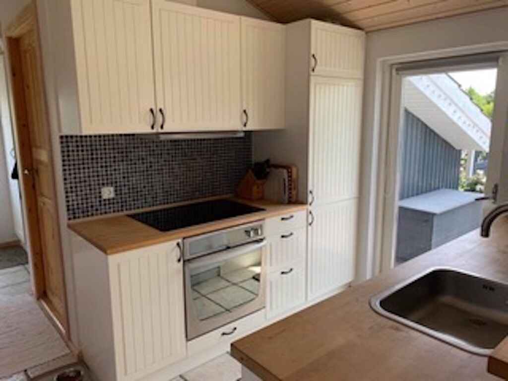 Das Haus ist gemütlich eingerichtet mit großen, hellen Räumen sowie Fußbodenheizung in Flur, Bad und Küche. Küche und Wohnzimmer sind offen miteinander verbunden. Die zweiseitige Küche ist gepflegt und mit weißen Fronten sowie Holzarbeitsplatten ausgestattet. Das Wohnzimmer verfügt über einen schönen Holzboden und einen Kaminofen, den Sie bei Bedarf anheizen können. Entspannen Sie auf dem komfortablen Sofa, genießen Sie gemeinsame Mahlzeiten am Esstisch und nutzen Sie im Sommer den direkten Zugang zur überdachten Terrasse.