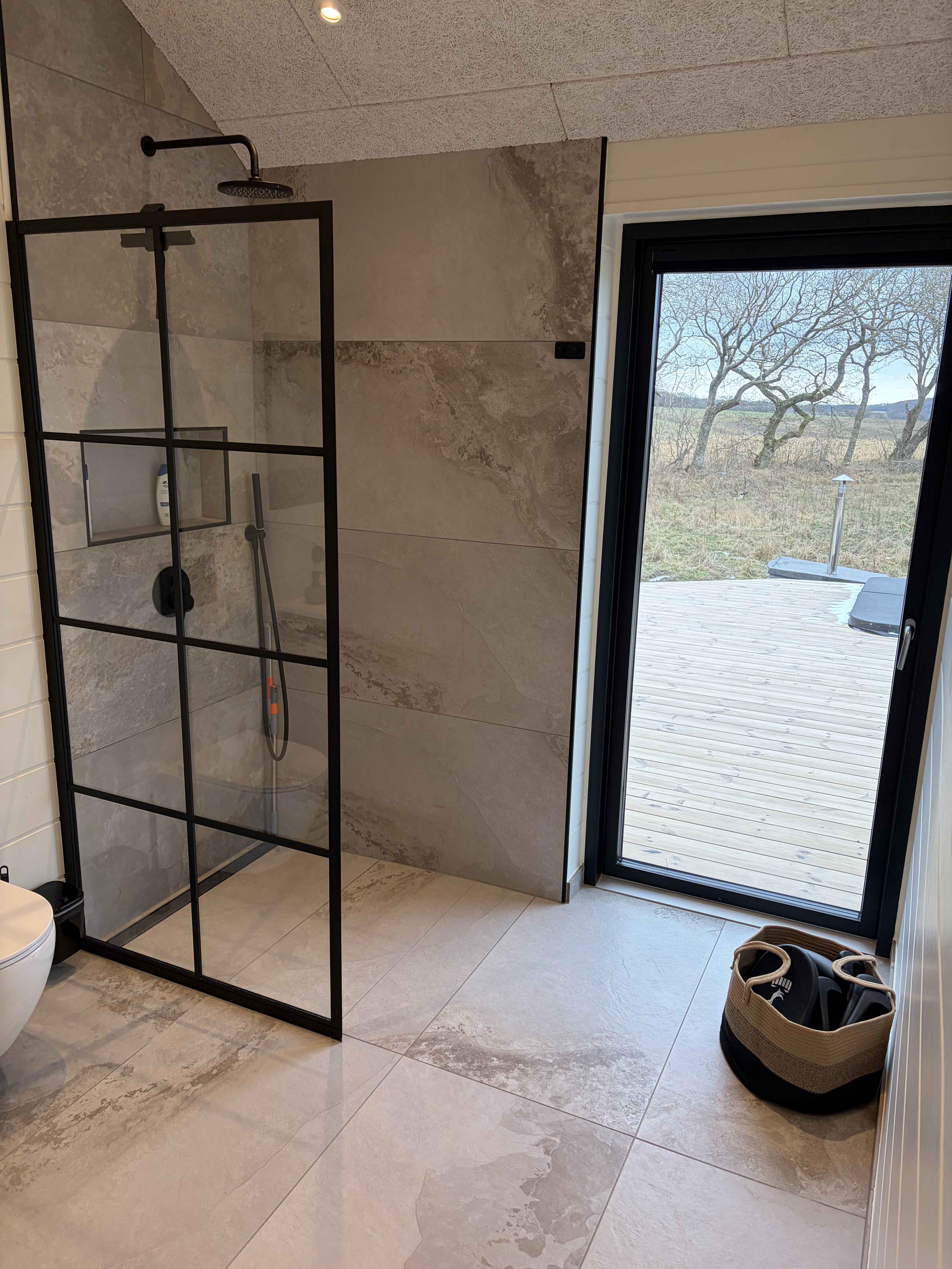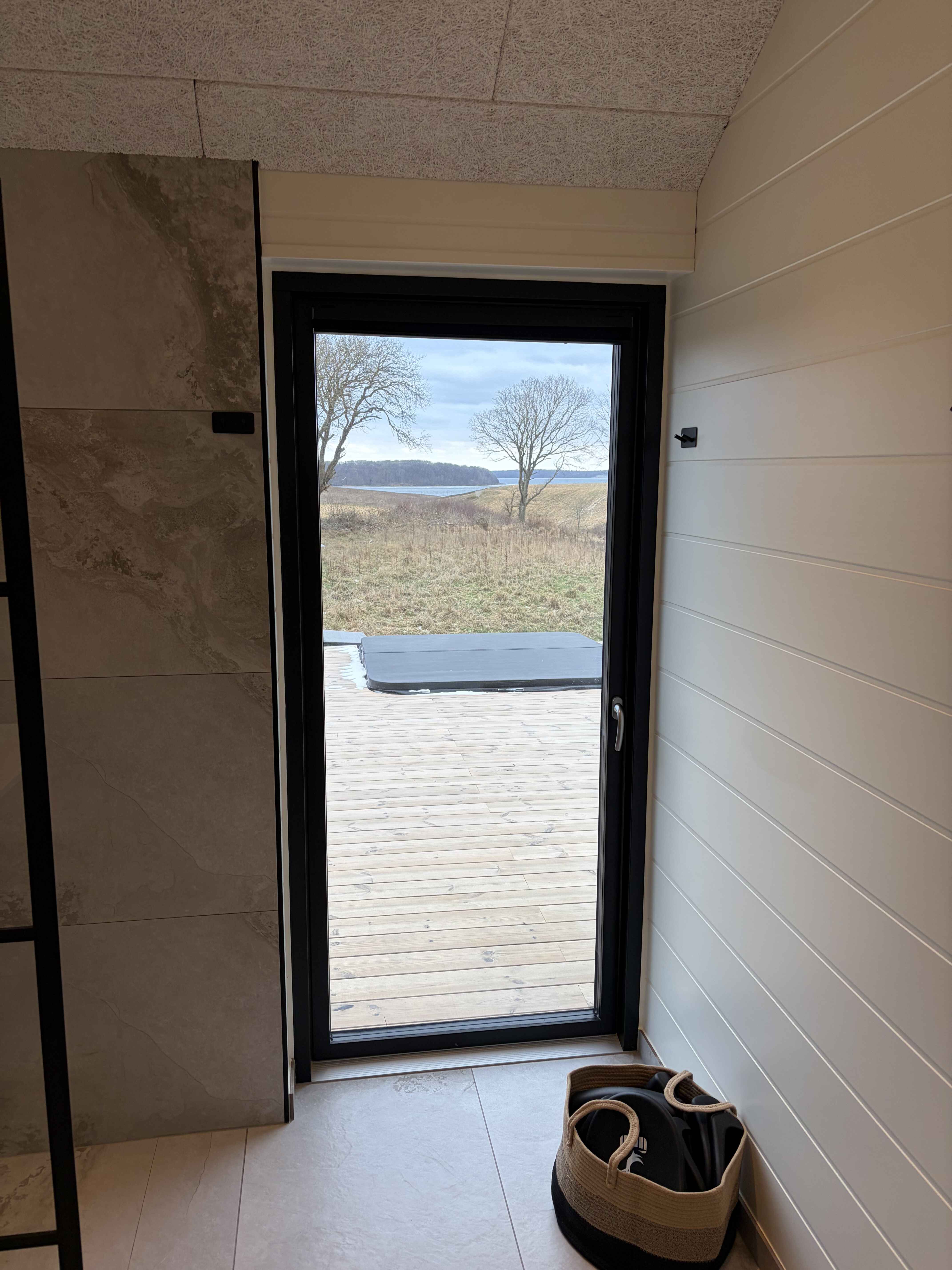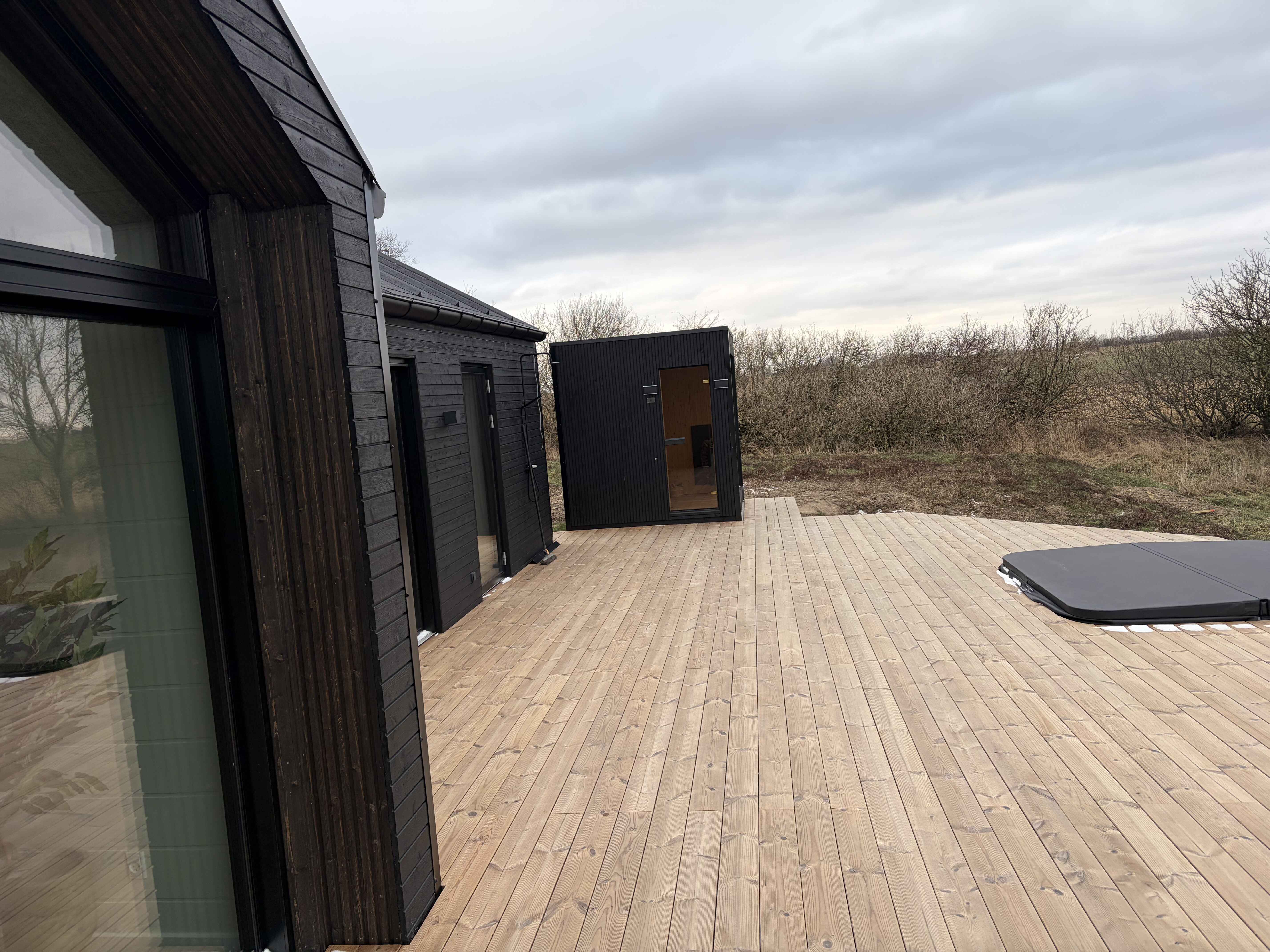 300 m² Holzterrasse mit Außendusche (warm/kalt), eingelassenem Whirlpool für 8 Personen und elektrisch beheizter Sauna mit Blick auf den Limfjord.