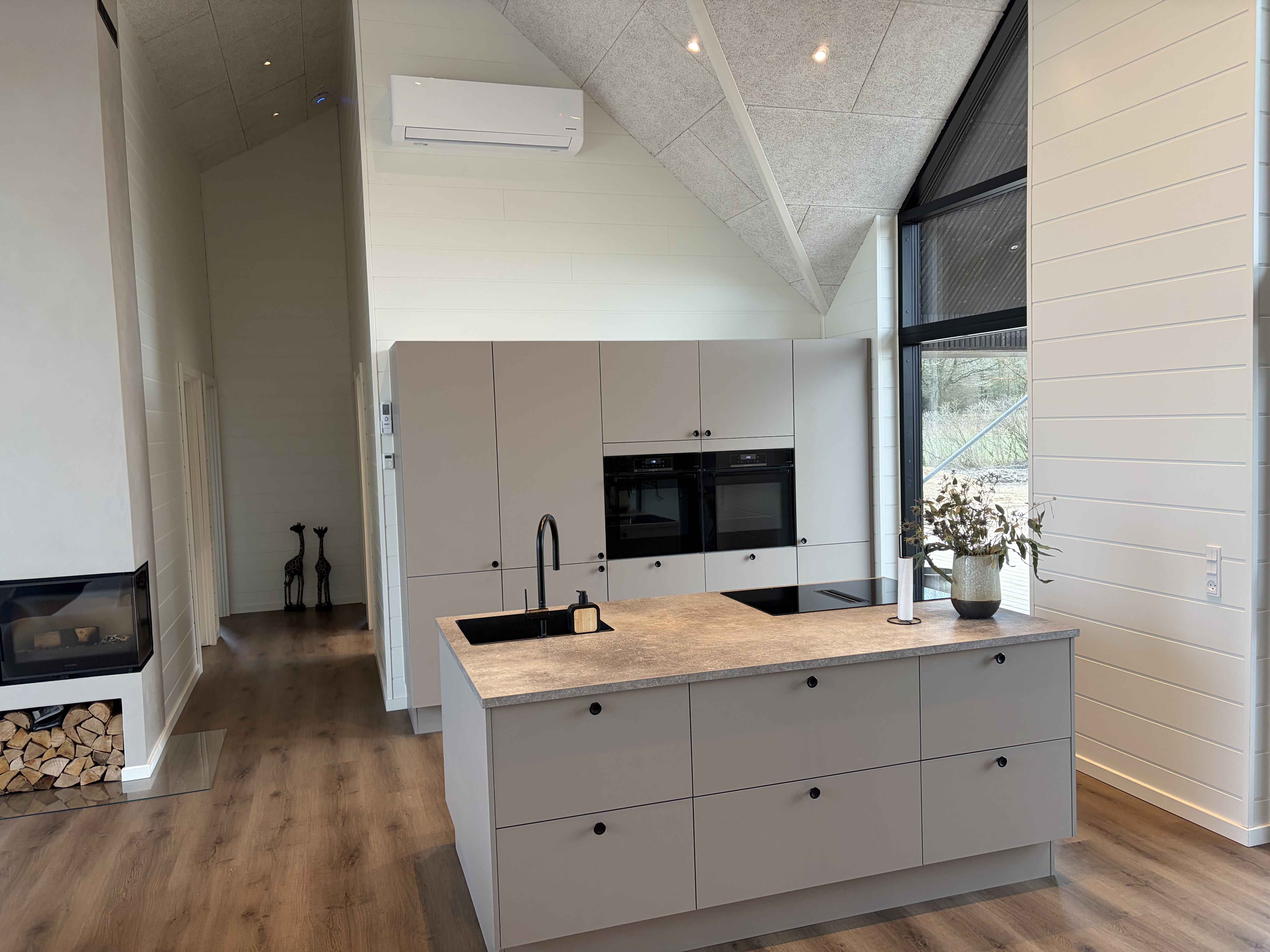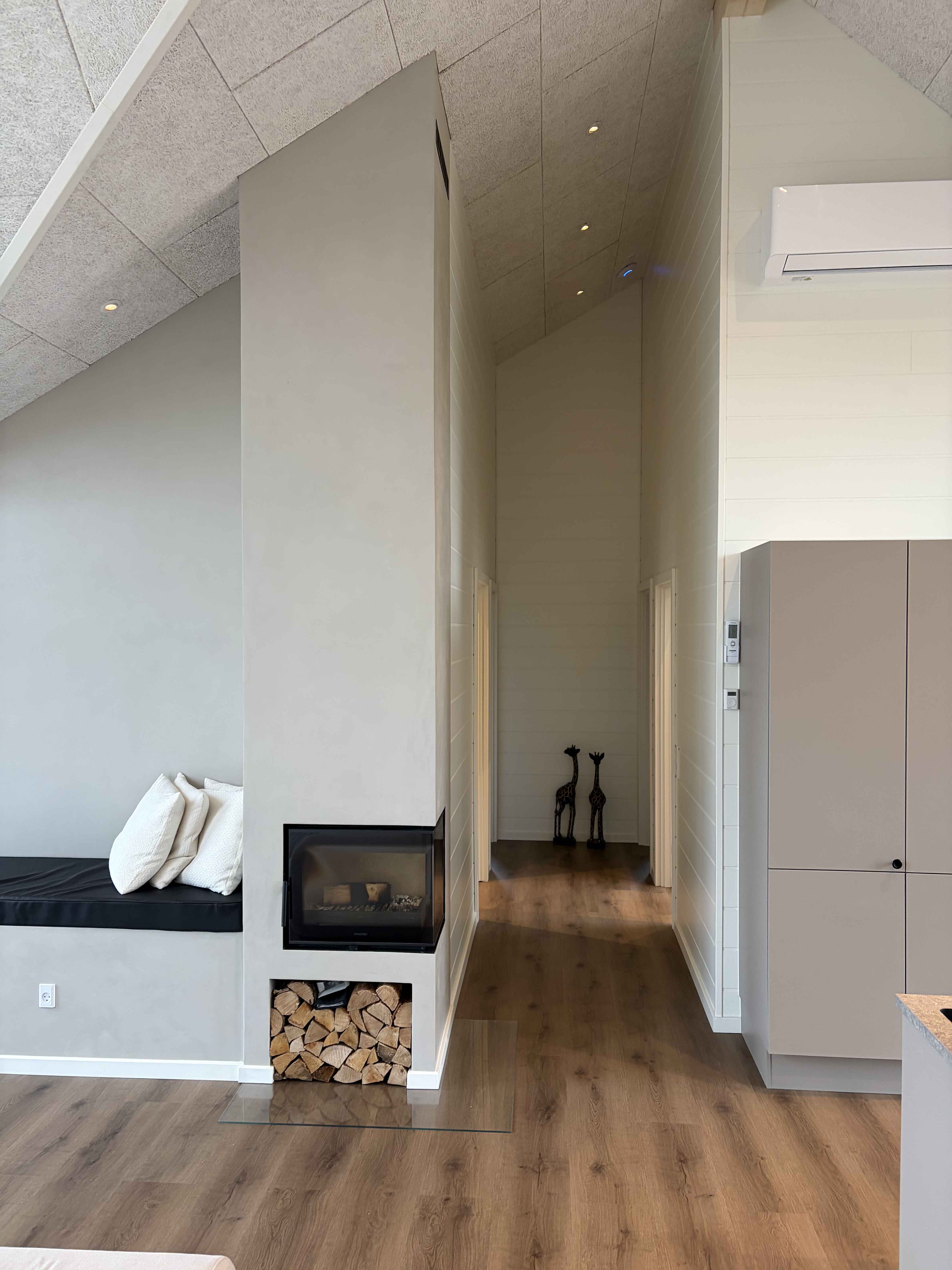 Draußen gibt es eine überdachte Terrasse mit großem Dachfenster, einen Morsø-Holzpizzaofen und einen Weber-Holzkohlegrill. Wohnzimmer mit großer Couch und eingebautem Kaminofen.