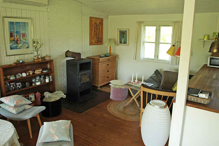 Schöne Küche mit Geschirrspüler und halber Tür zum Garten. Toll an einem Sommermorgen, um die obere Halb tür öffnen zu können und eine Tasse Kaffee und den Blick auf das ganze Grün zu genießen. Die Küche steht in offener Verbindung mit dem Wohnzimmer, das über einen Holzofen und eine Tür zur Terrasse verfügt. Das Wohnzimmer ist gemütlich eingerichtet mit einem schönen Essbereich am Fenster und einer gemütlichen Ecke mit Sesseln.
